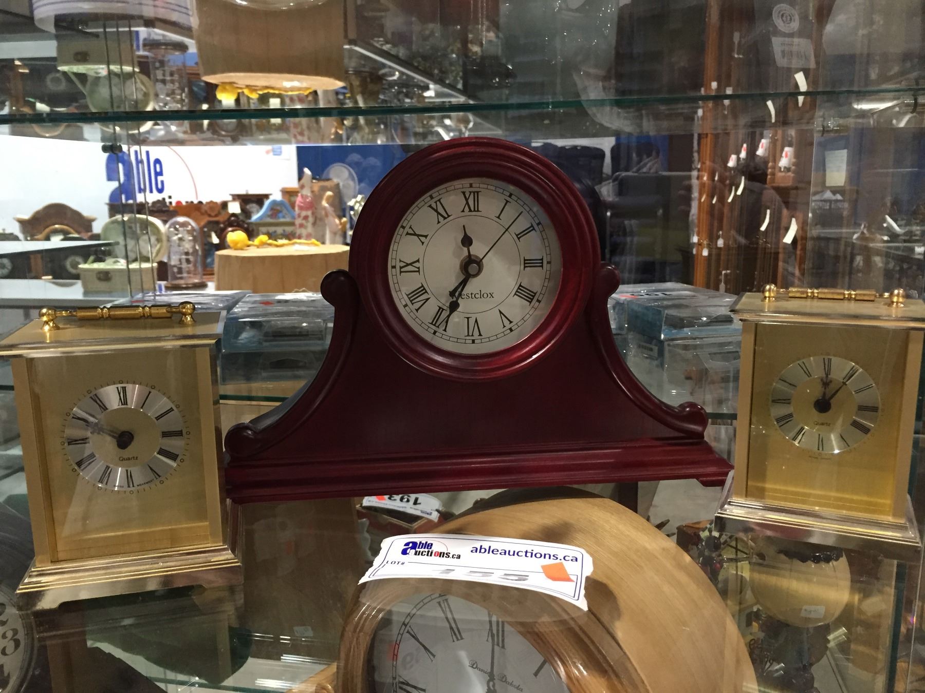 WESTCLOX WOODEN MANTLE CLOCK WITH 2 WESTERN GERMANY BATTERY OPERATED CLOCKS