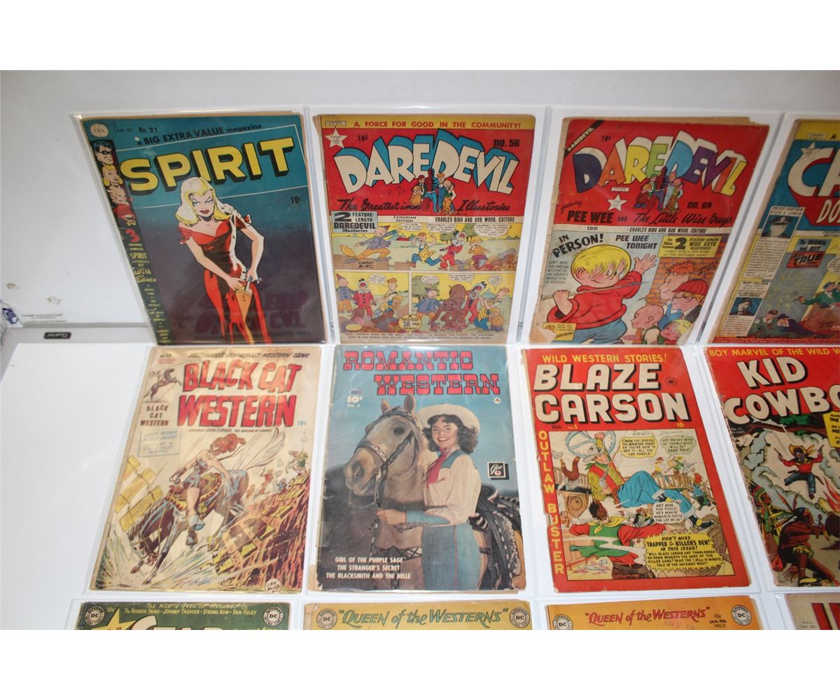 WESTERN/CRIME GOLDEN AGE LOT (1949-53) MIXED LOT OF 20 ISSUES, 11 ARE CANADIAN EDITION. INCLUDES SPIRIT #21, CLACK CAT WESTERN #17, TOMAHAWK #16, ETC. LOWER GRADE AVG. 5 ARE COVERLESS.