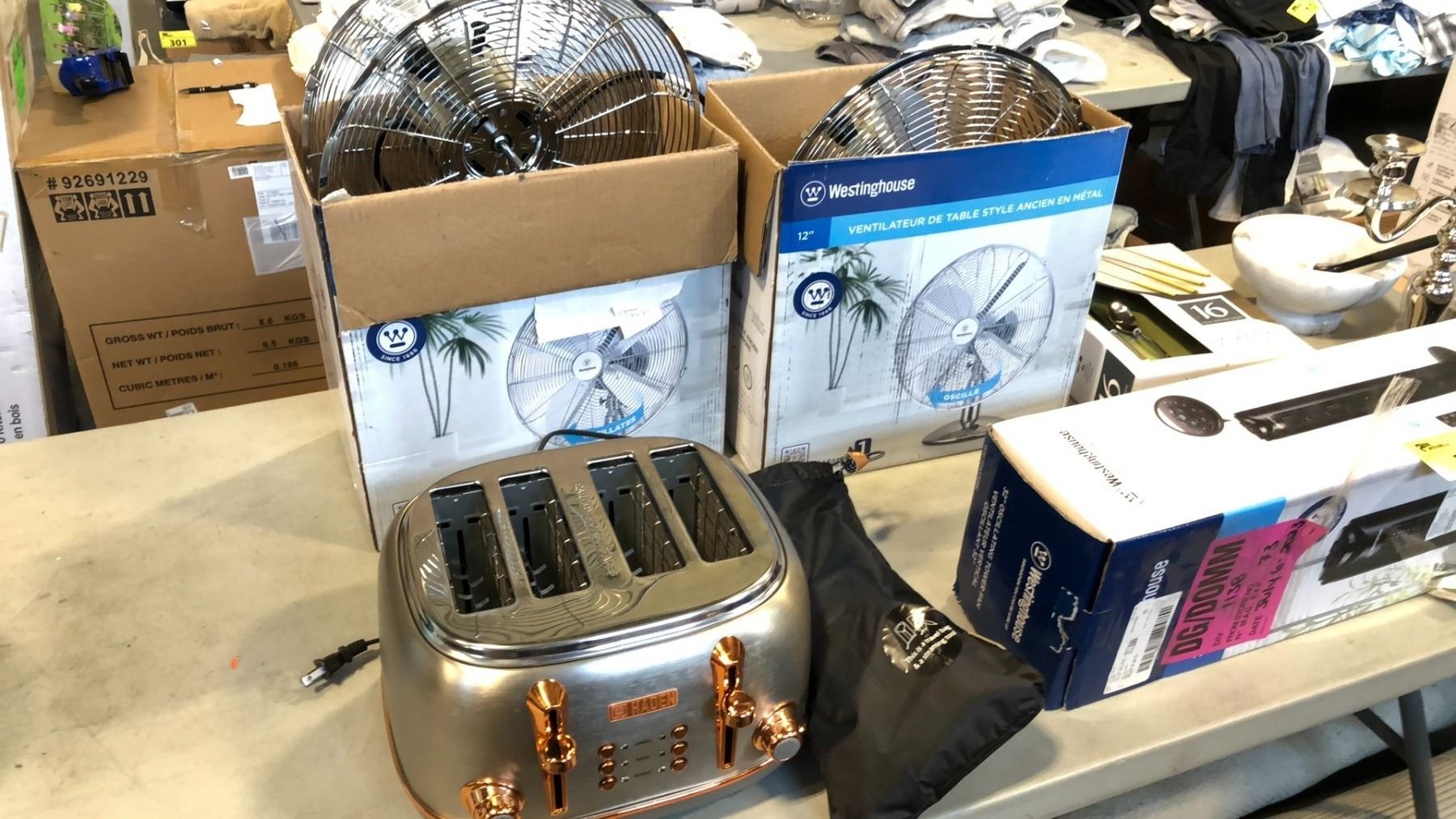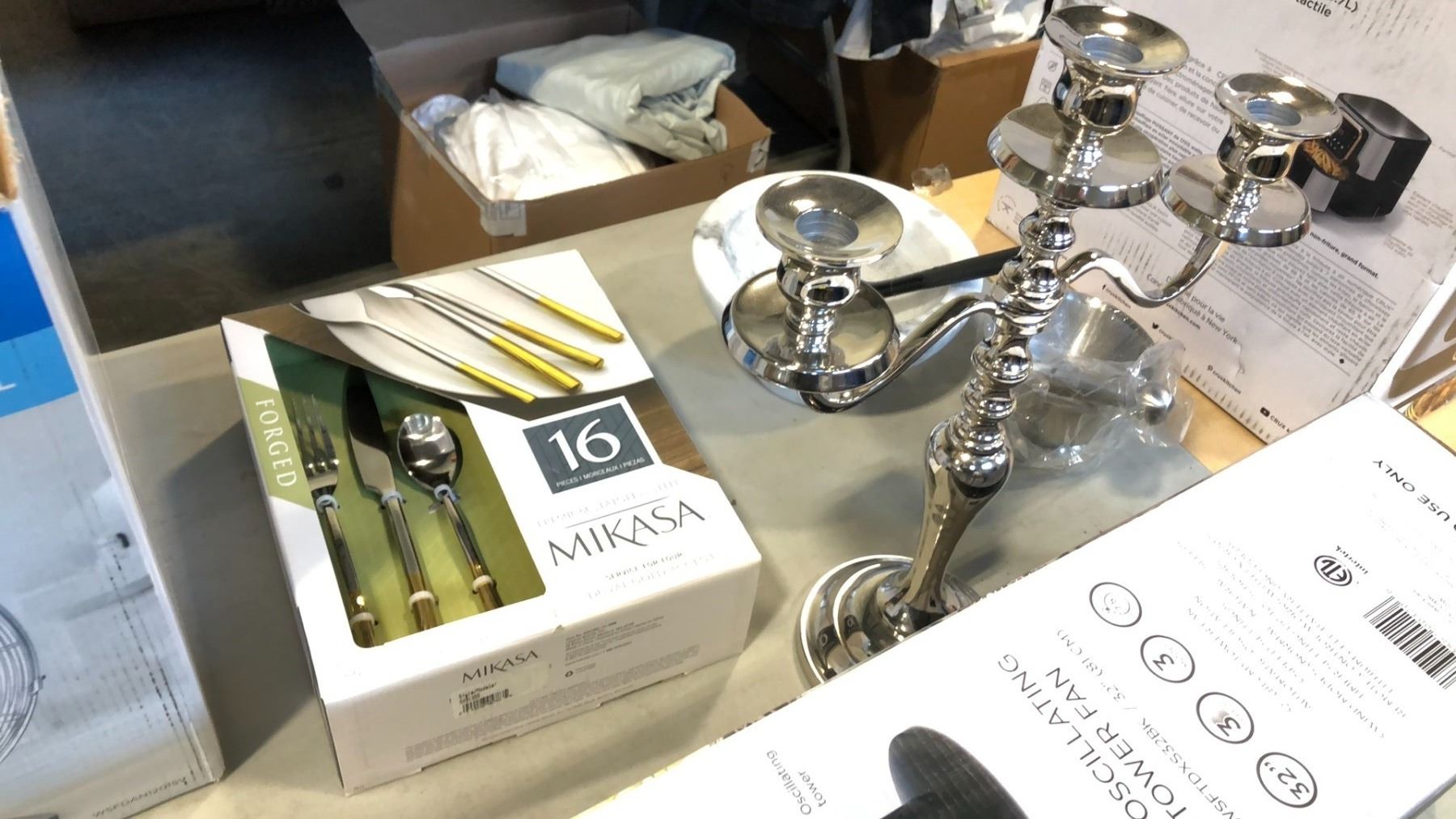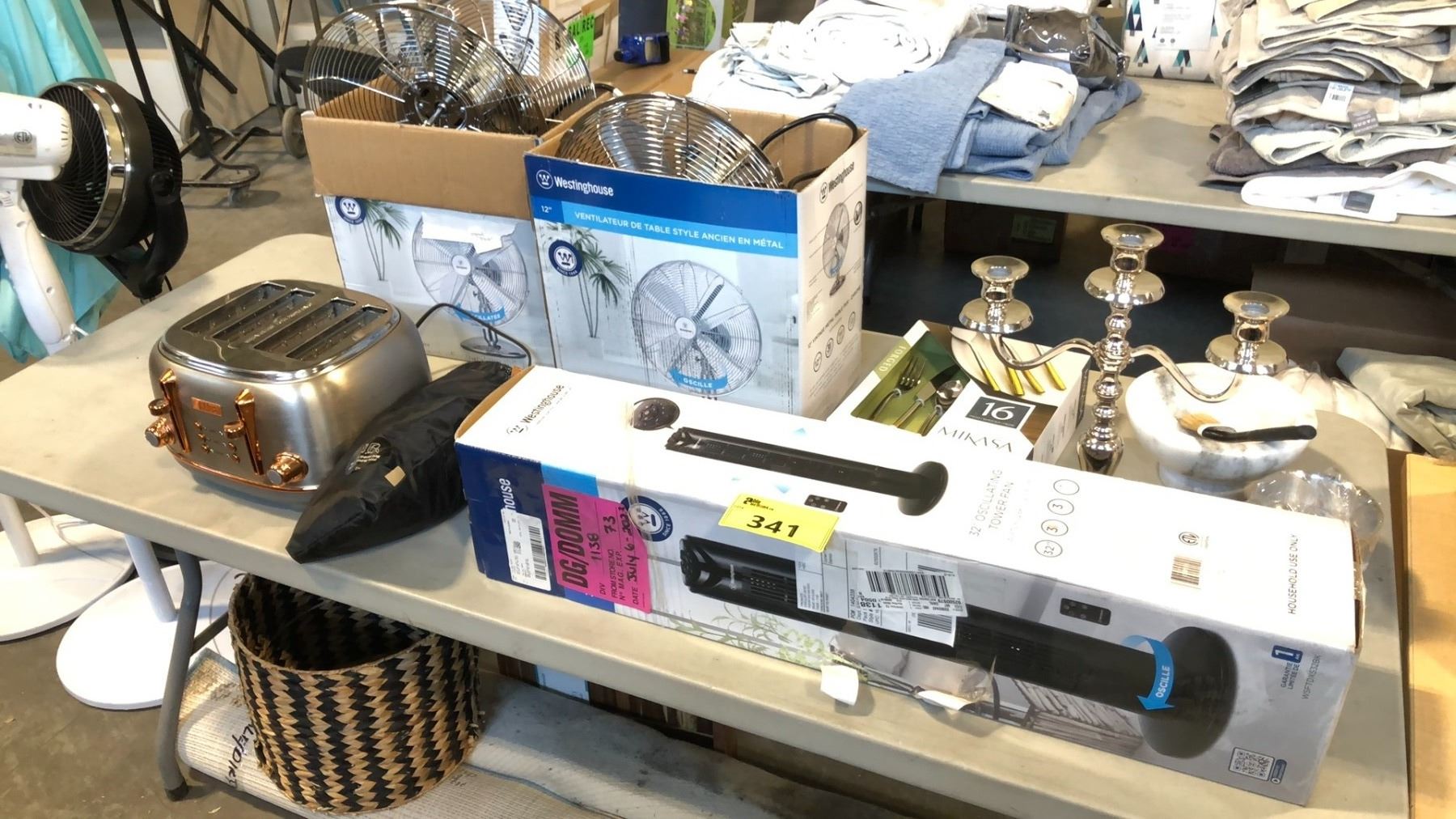 WESTINGHOUSE OSCILLATING TOWER, 2 VINTAGE LOOK TABLE FANS, CHROME CANDLE HOLDER, HADEN 4-SLICE TOASTER, STEAMERY STEAMER GUN AND MIKASA FLATWARE