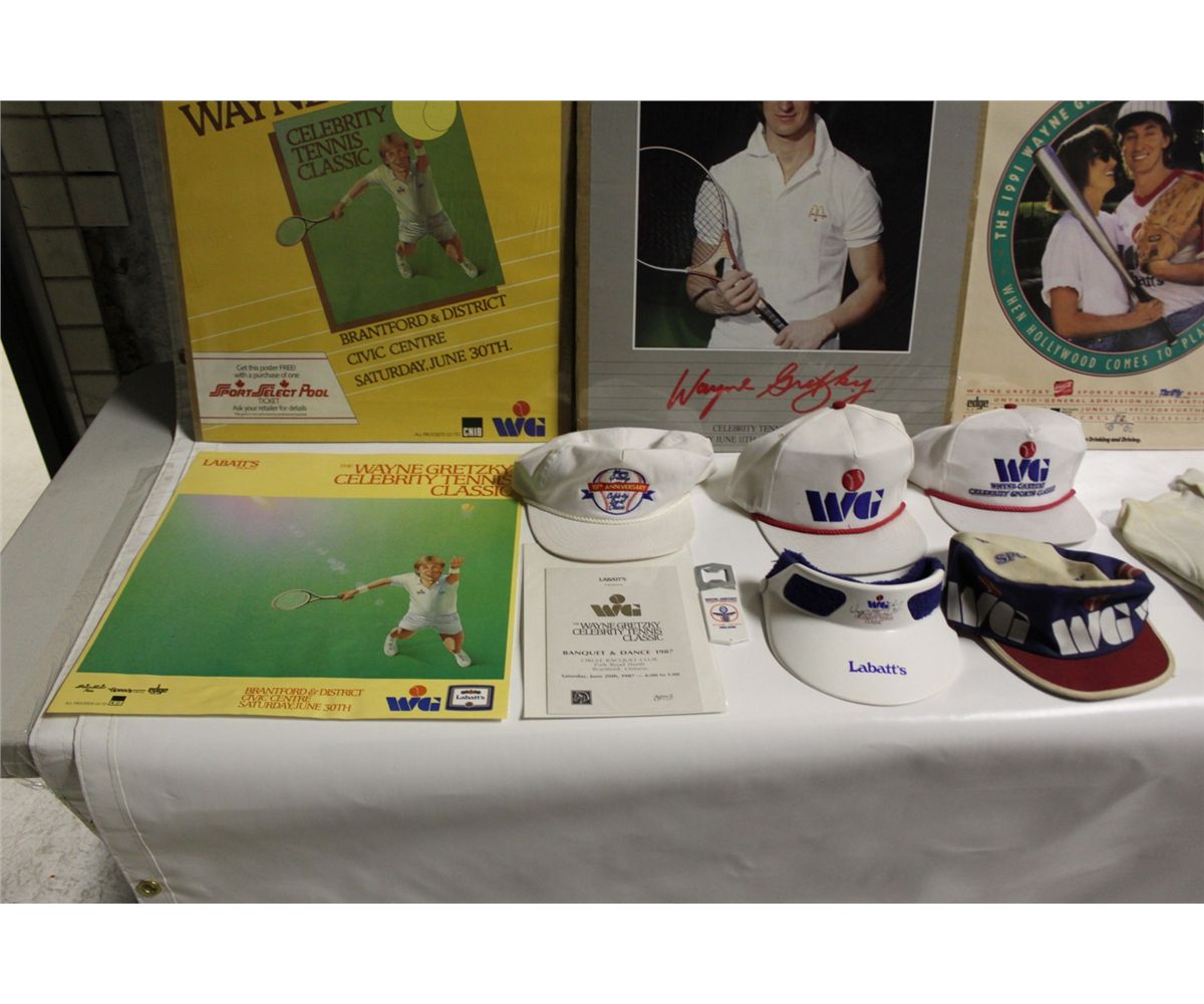WG CELEBRITY TENNIS ITEMS INCLUDING: 3 POSTERS, 5 HATS, 1 GOLF SHIRT, BOTTLE OPENER, 1987 BANQUET & DANCE PROGRAM, LABATT'S BASEBALL POSTER & 7 COLLECTOR BUTTIONS & 2 COLLECTOR BEER CUPS