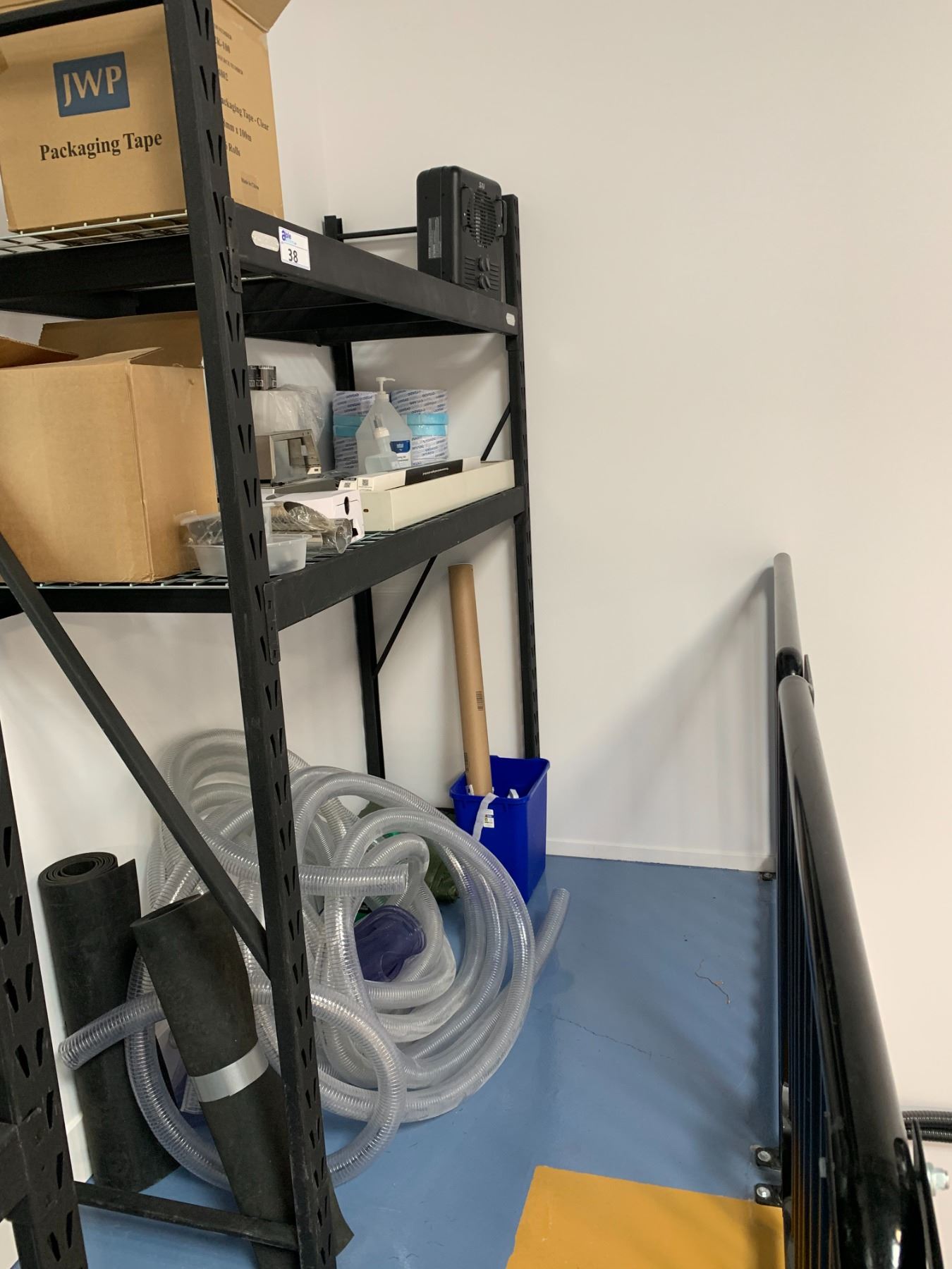WHALEN BLACK METAL SHELVING UNIT & CONTENTS - APPROX.5FT ACROSS X 7FT HIGH X 2FT WIDE 2 SHELVES WITH MESH DECK