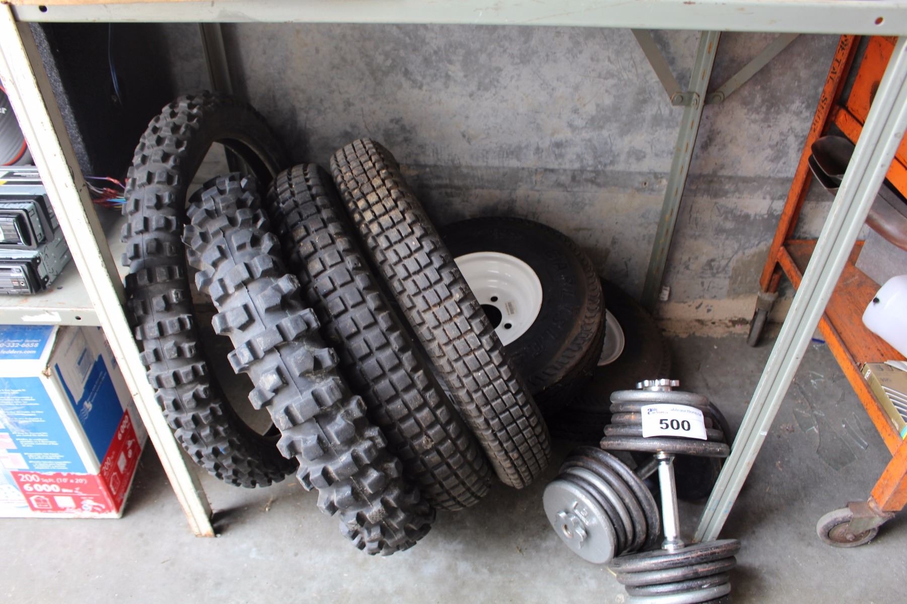 WHEELS, TIRES, AND 2 DUMB BELLS