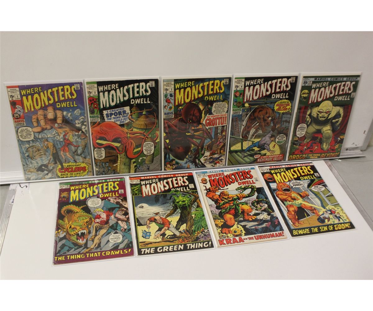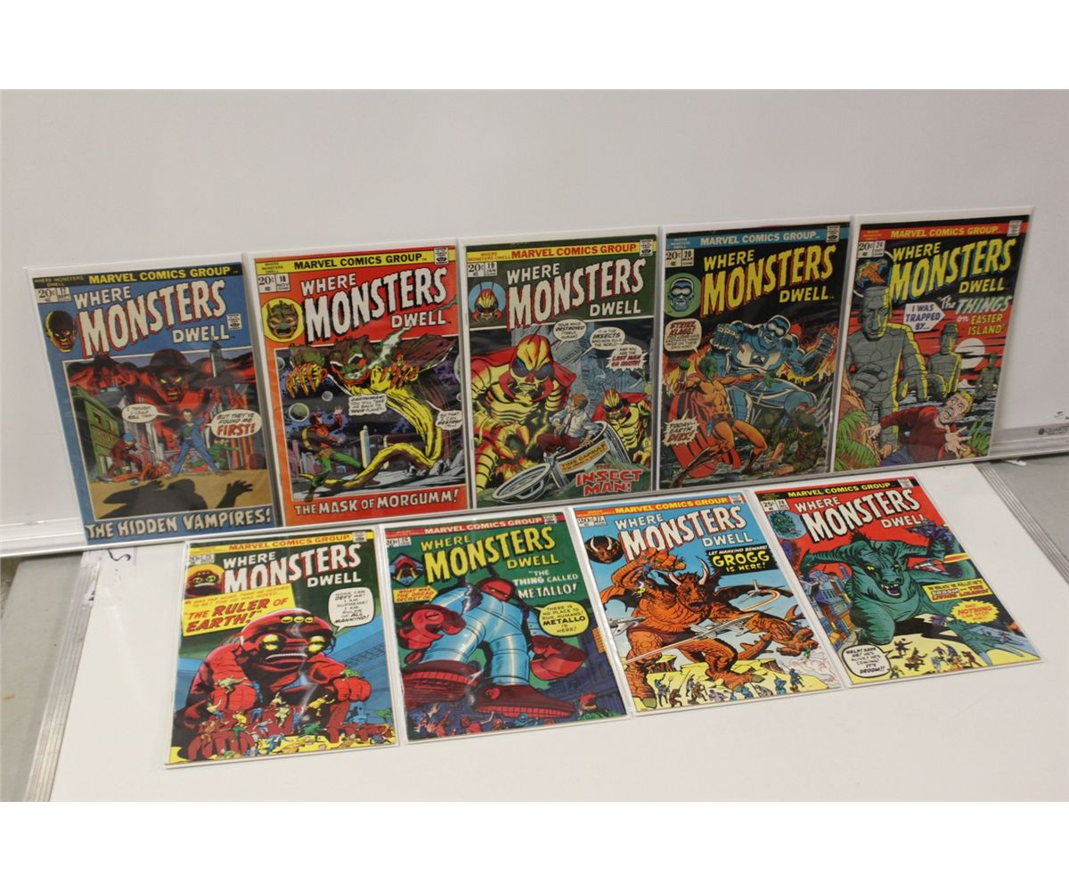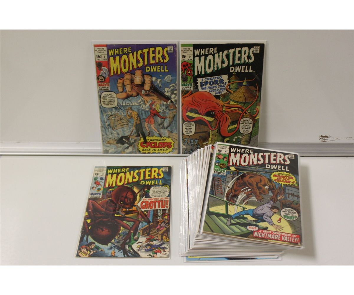 WHERE MONSTERS DWELL (MARVEL) NEAR COMPLETE BRONZE SET. 26 DIFFERENT ISSUES BETWEEN #1-38 (LAST ISSUE)  1970-75. MIXED GRADES, MANY SHARP COPIES.