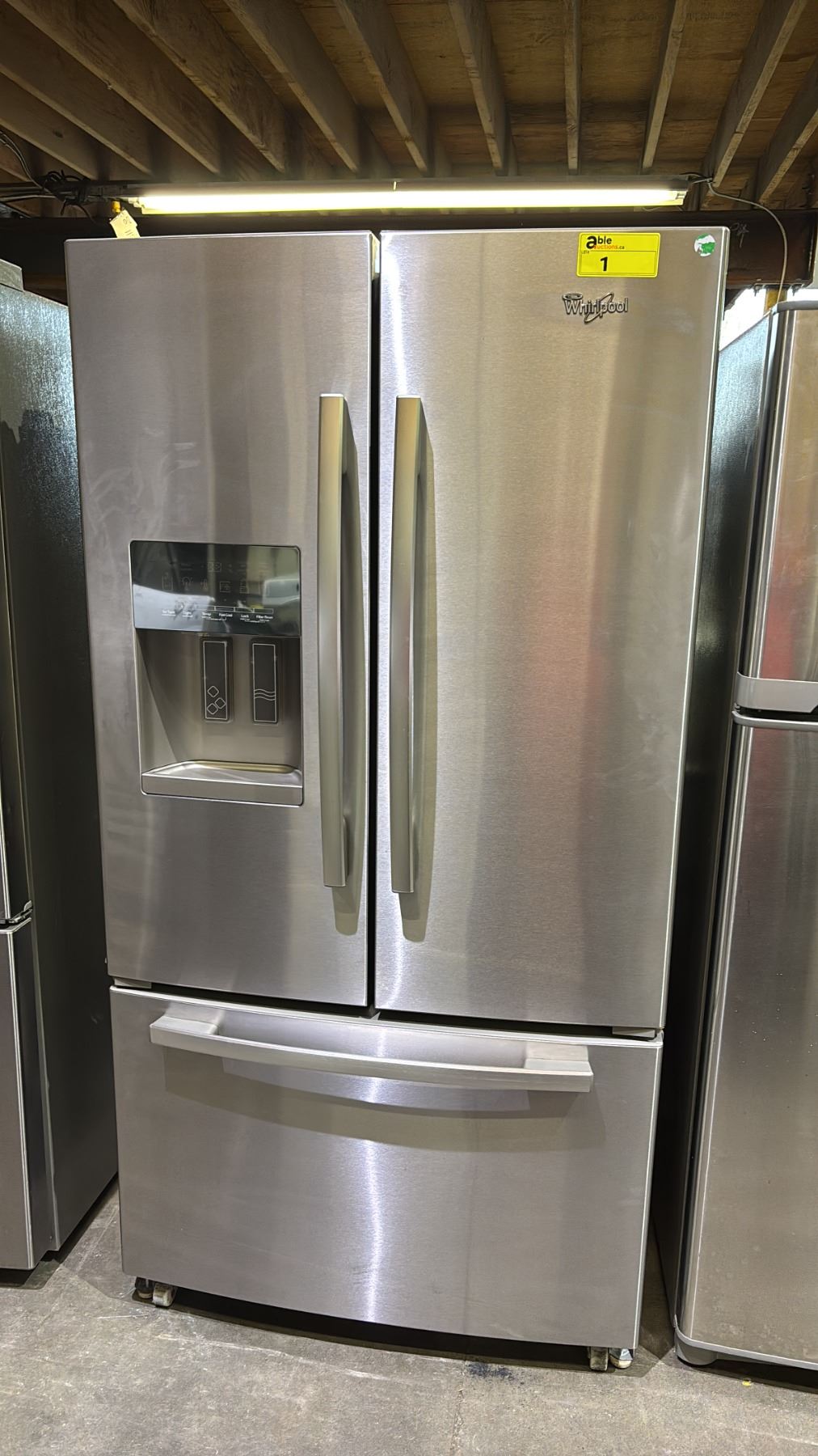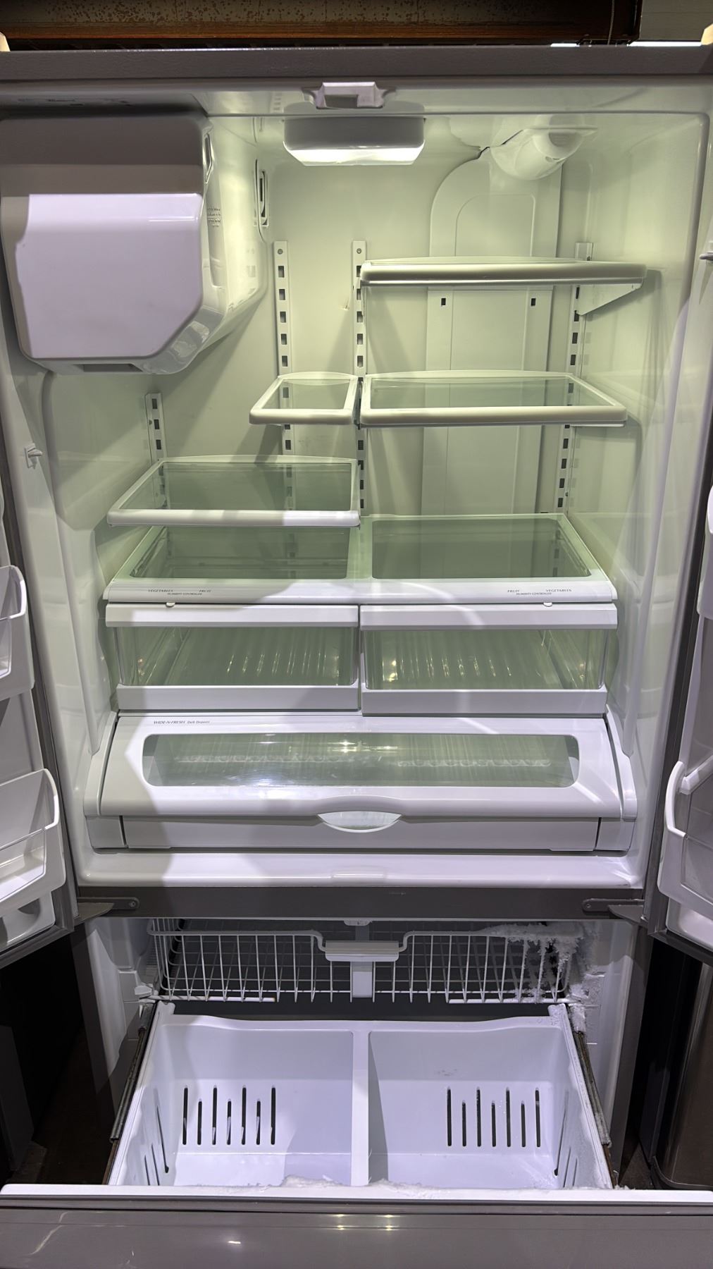 WHIRLPOOL STAINLESS STEEL FRENCH DOOR FRIDGE WITH ROLLOUT FREEZER & WATER/ICE DISPENSER 35.5"W
