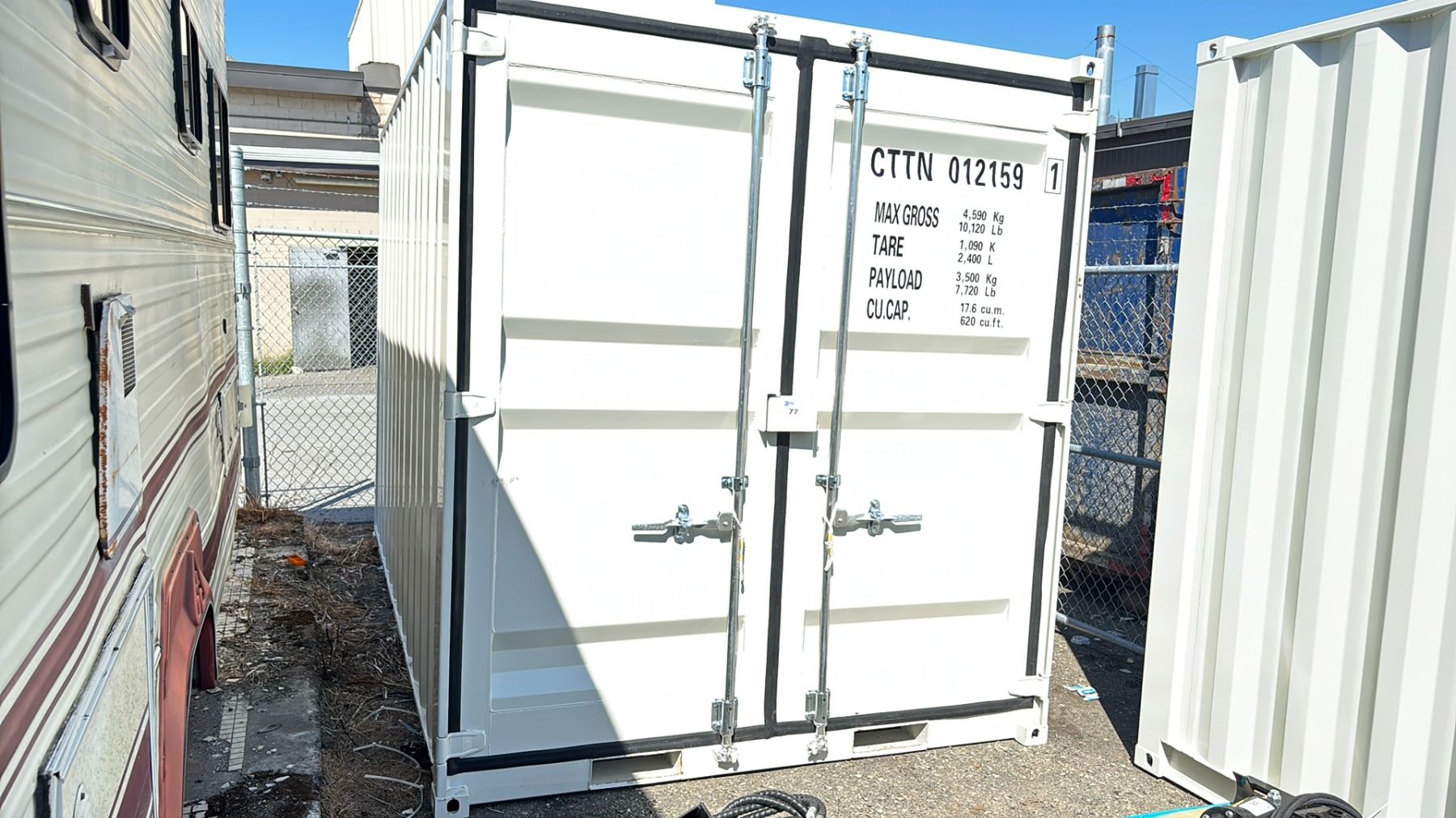 WHITE 12' 10,120 LBS MAXIMUM CAPACITY INDUSTRIAL OFFICE CONTAINER WITH DOUBLE SWING FRONT DOORS, SINGLE SIDE DOOR (36"W) & WINDOW (32.5"W) 98.5"H X 87.5"W X 12'L CTTN 012159 *FRIDAY REMOVAL*