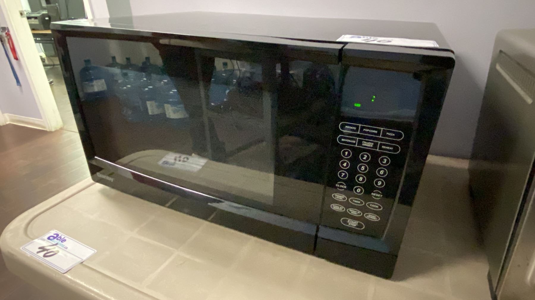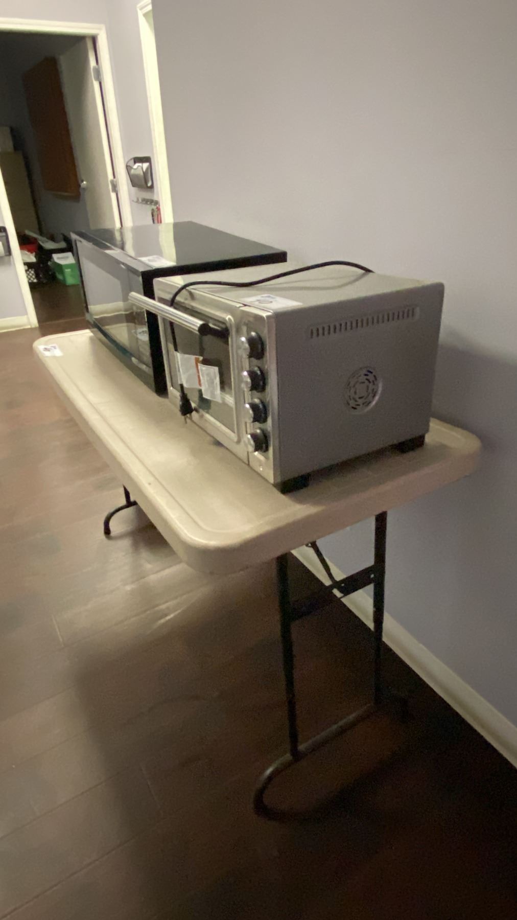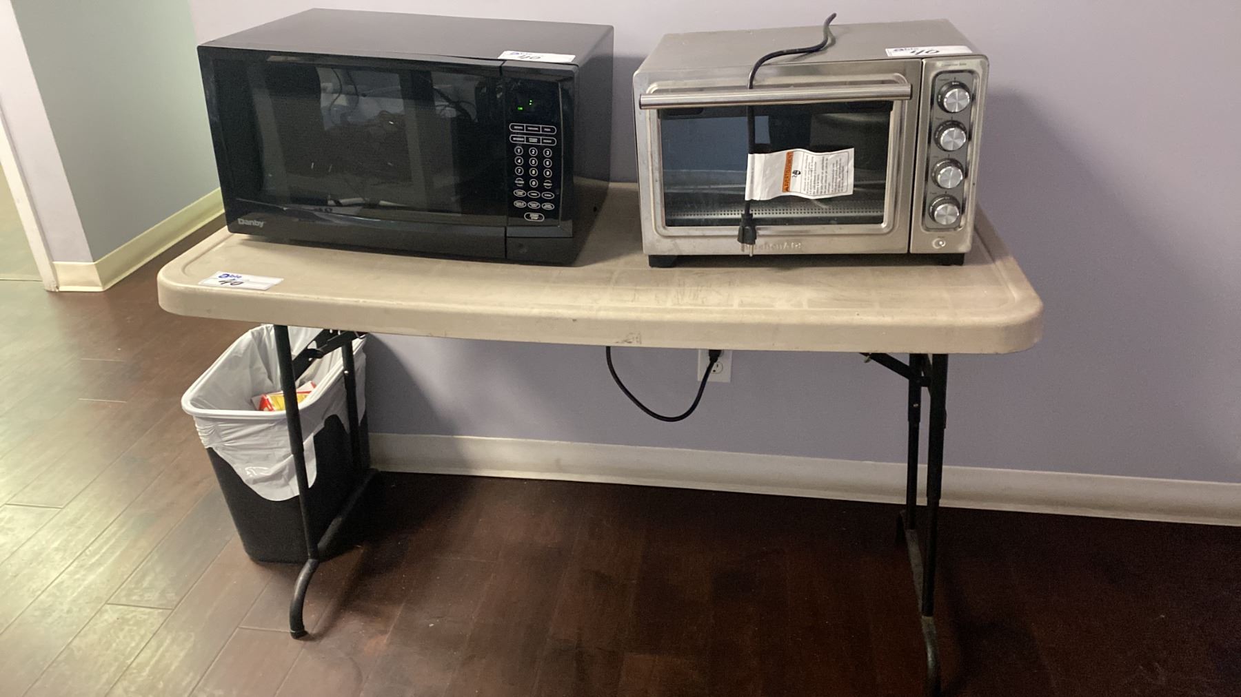 WHITE 2 DOOR FRIDGE, BLACK DANBY MICROWAVE, STAINLESS STEEL KITCHENAID TOASTER OVEN, BLACK NINJA AIR FRYER, KEURIG COFFEE MAKER, 2 SLICE TOASTER AND SMALL FOLDING TABLE