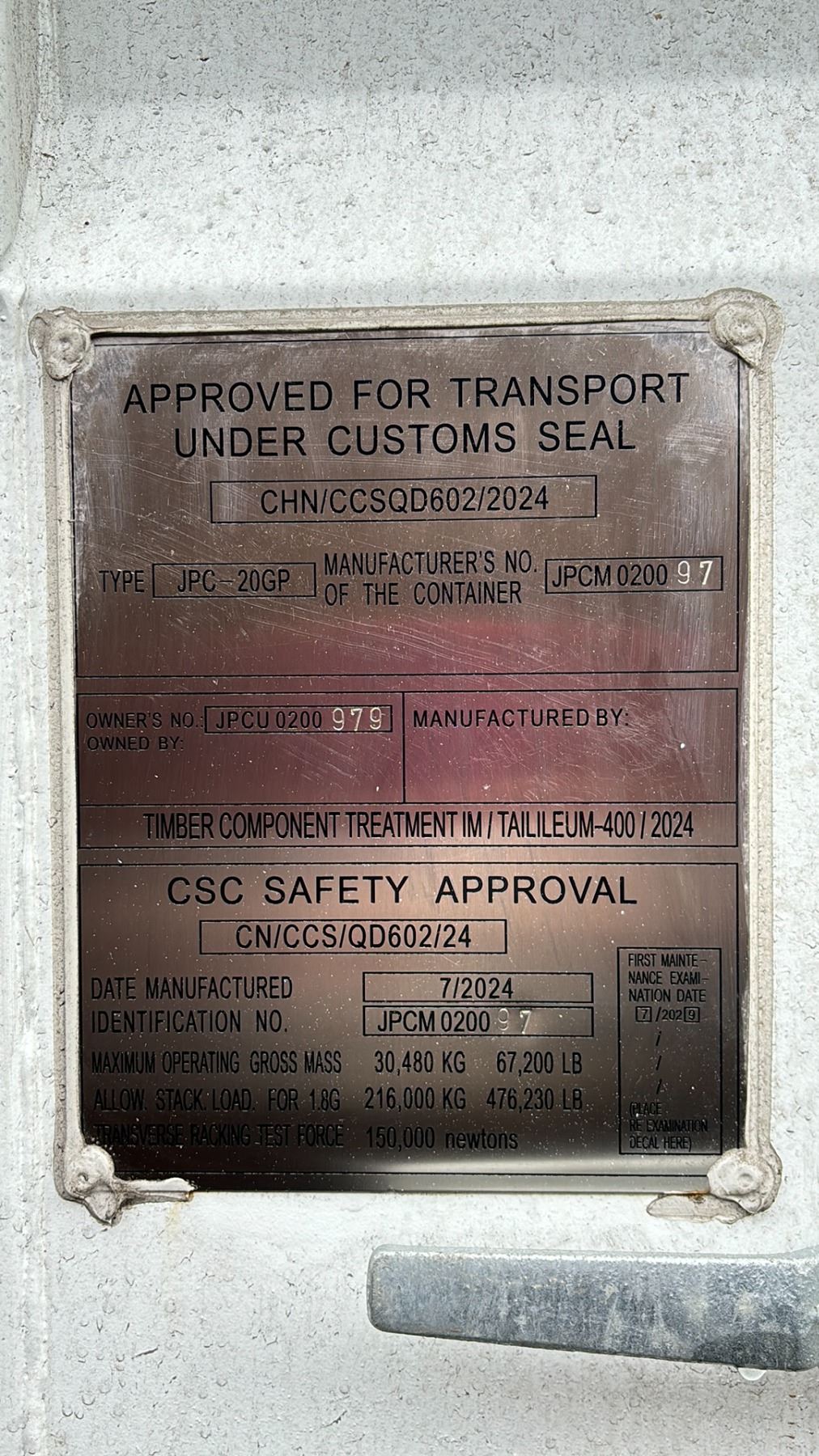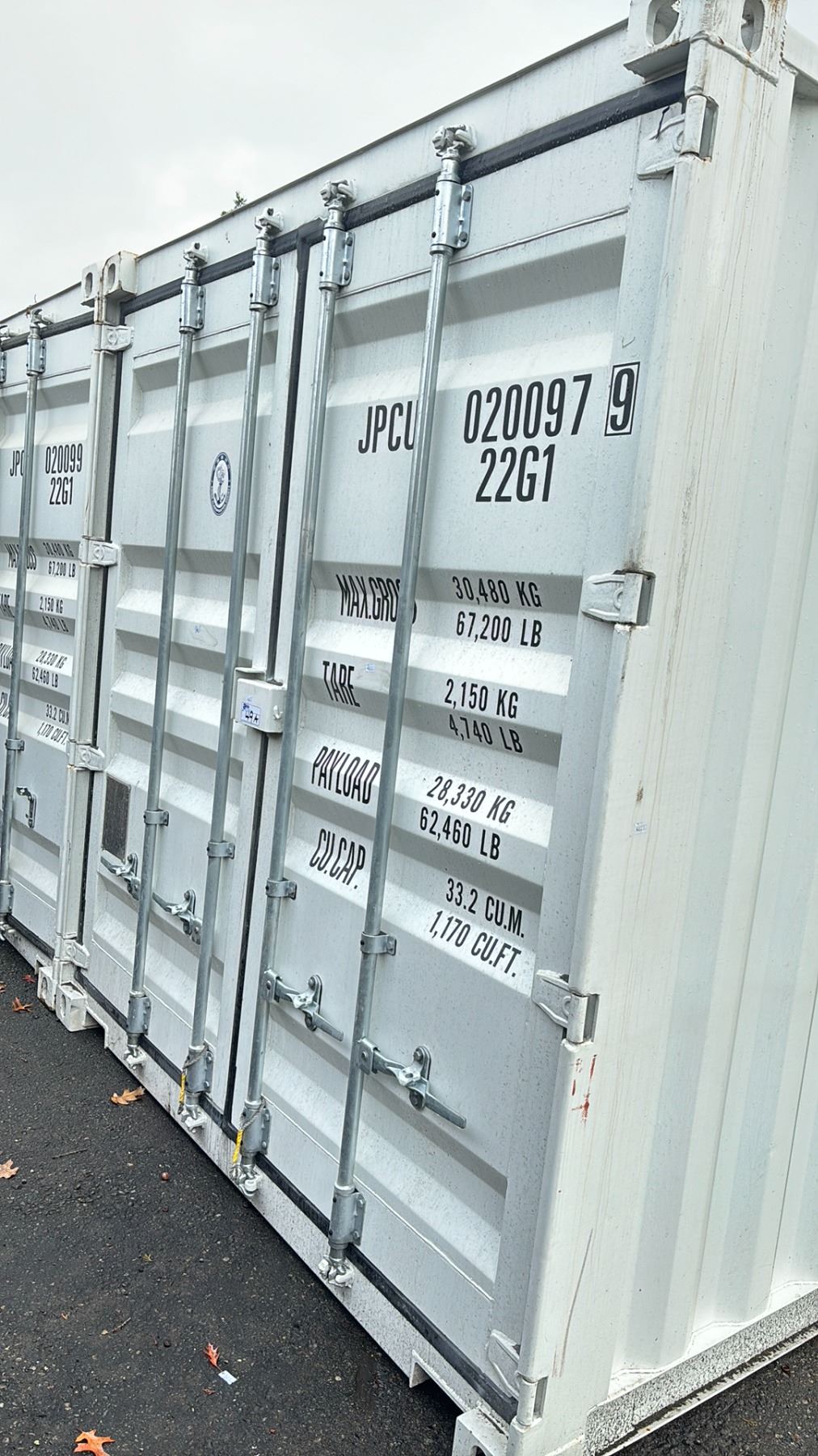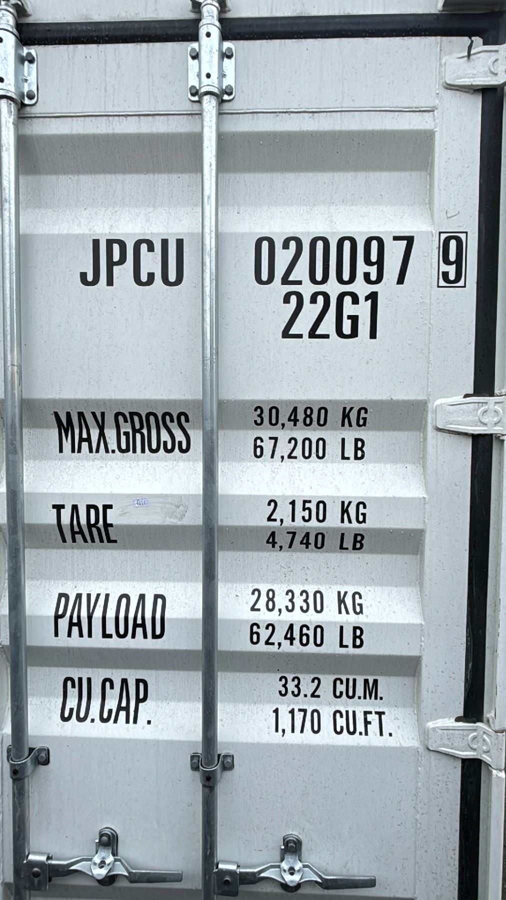 WHITE 20FT 67,200 MAX CAPACITY INDUSTRIAL TRANSPORT CONTAINER, DUAL SWING REAR DOORS WITH CAM LOCKS 20'L X 96"W X 101"H - JPCU 0200979 *REQUIRES HIAB CRANE OR TILT DECK TRAILER TO TRANSPORT, LAST DAY REMOVAL, SUNDAY ONLY*