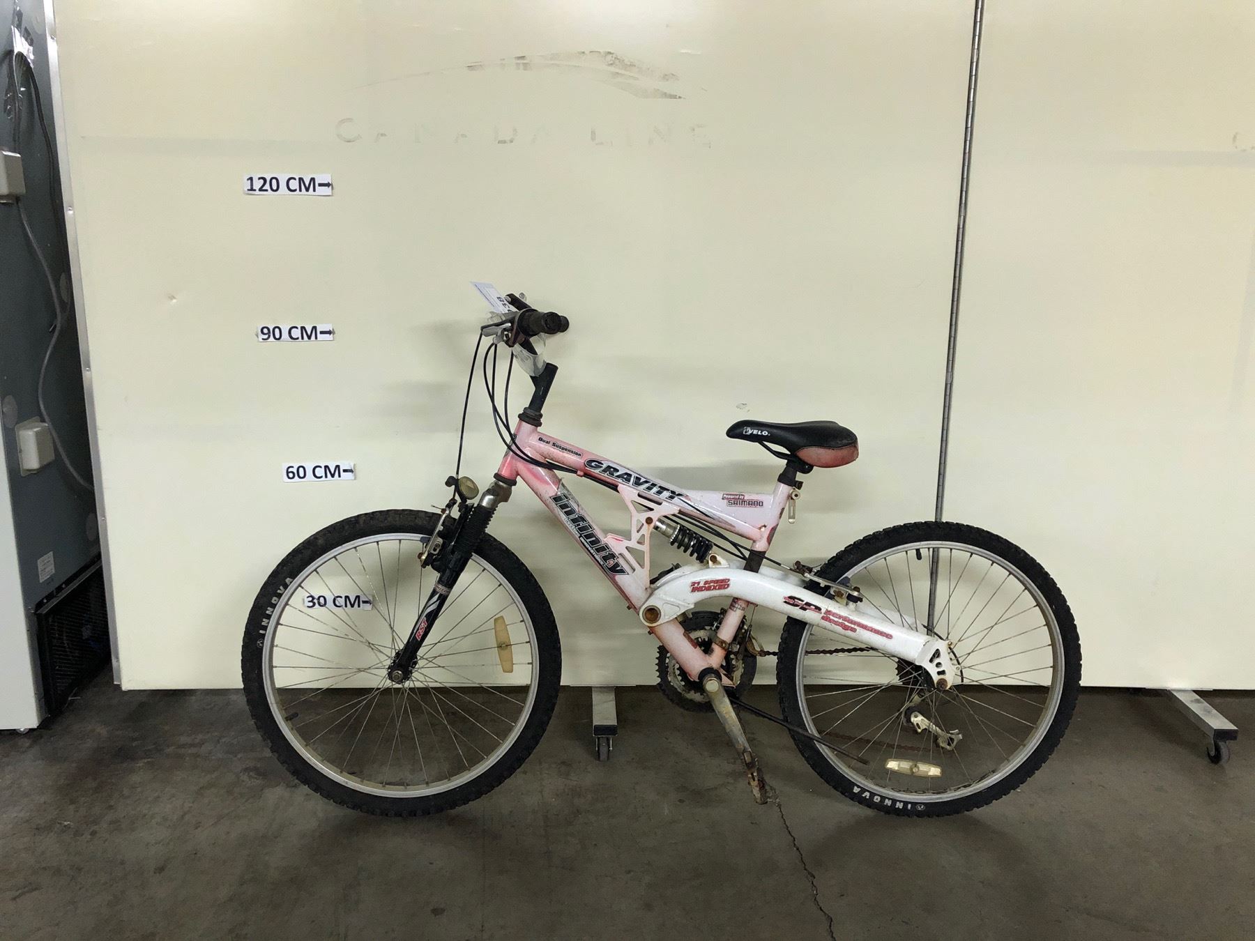 WHITE AND RED INFINITY GRAVITY FULL SUSPENSION 21 SPEED MOUNTAIN BIKE