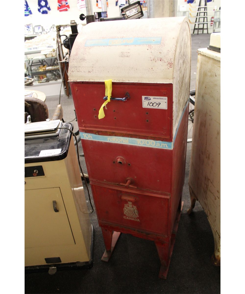 WHITE AND RED METAL CANADA POST MAIL BOX WITH CANADIAN COAT OF ARMS PRINTED CENTER BOTTOM