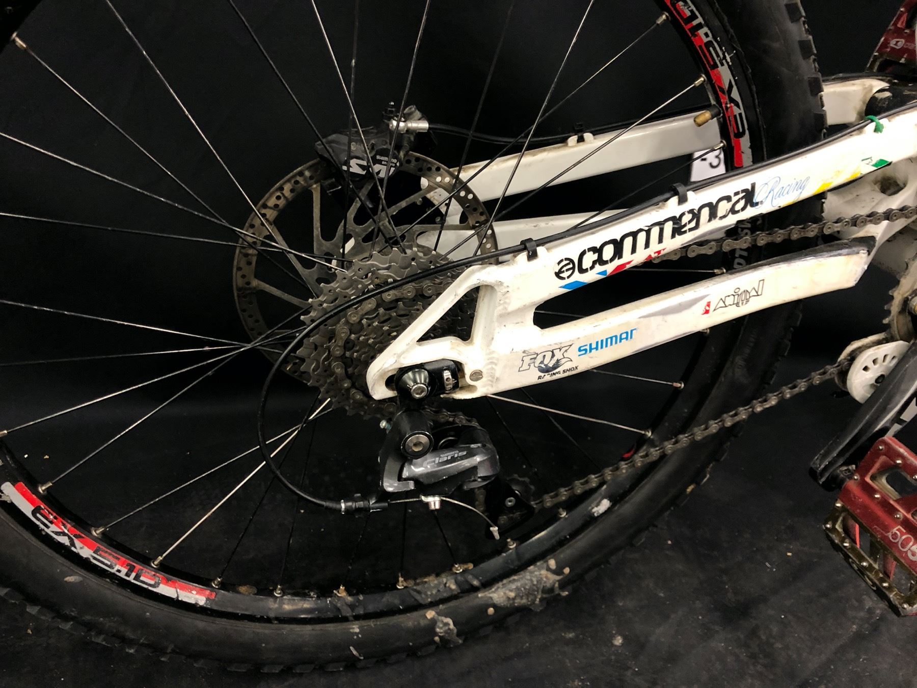 WHITE COMMENCAL SUPREME DH 9 SPEED FULL SUSPENSION DOWNHILL MOUNTAIN BIKE WITH FRONT AND REAR HYDRAULIC DISC BRAKES AND REMOTE SEAT HEIGHT ADJUSTMENT