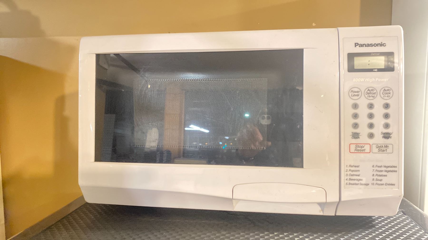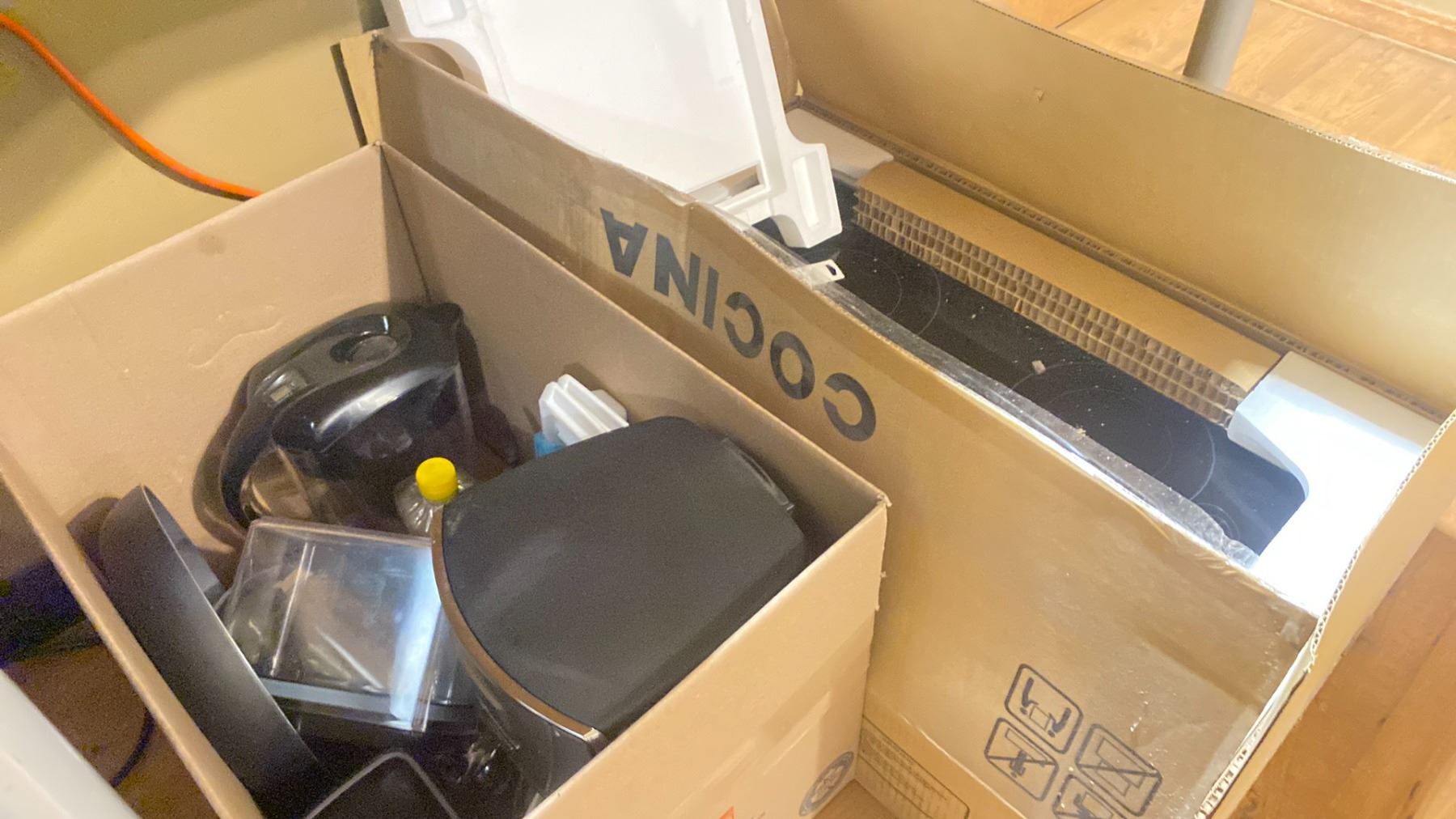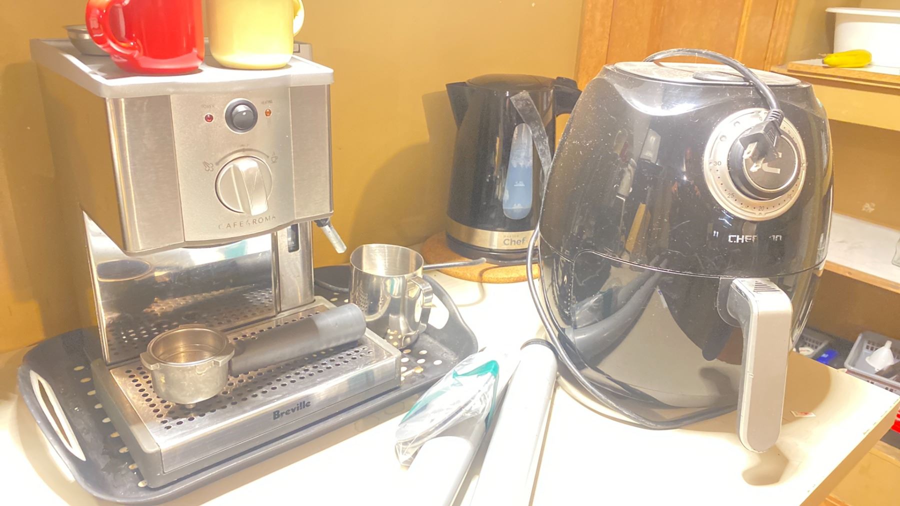 WHITE COUNTER HEIGHT TABLE FILLED WITH SMALL KITCHEN APPLIANCES - WHIRLPOOL INDUCTION COOKTOP, BREVILLE CAFE ROMA COFFEE MAKER, HAMILTON BEACH TOASTER OVEN, PANASONIC MICROWAVE OVEN, KNIFE BLOCK WITH KNIVES & ASSORTED MISCELLANEOUS KITCHEN ITEMS