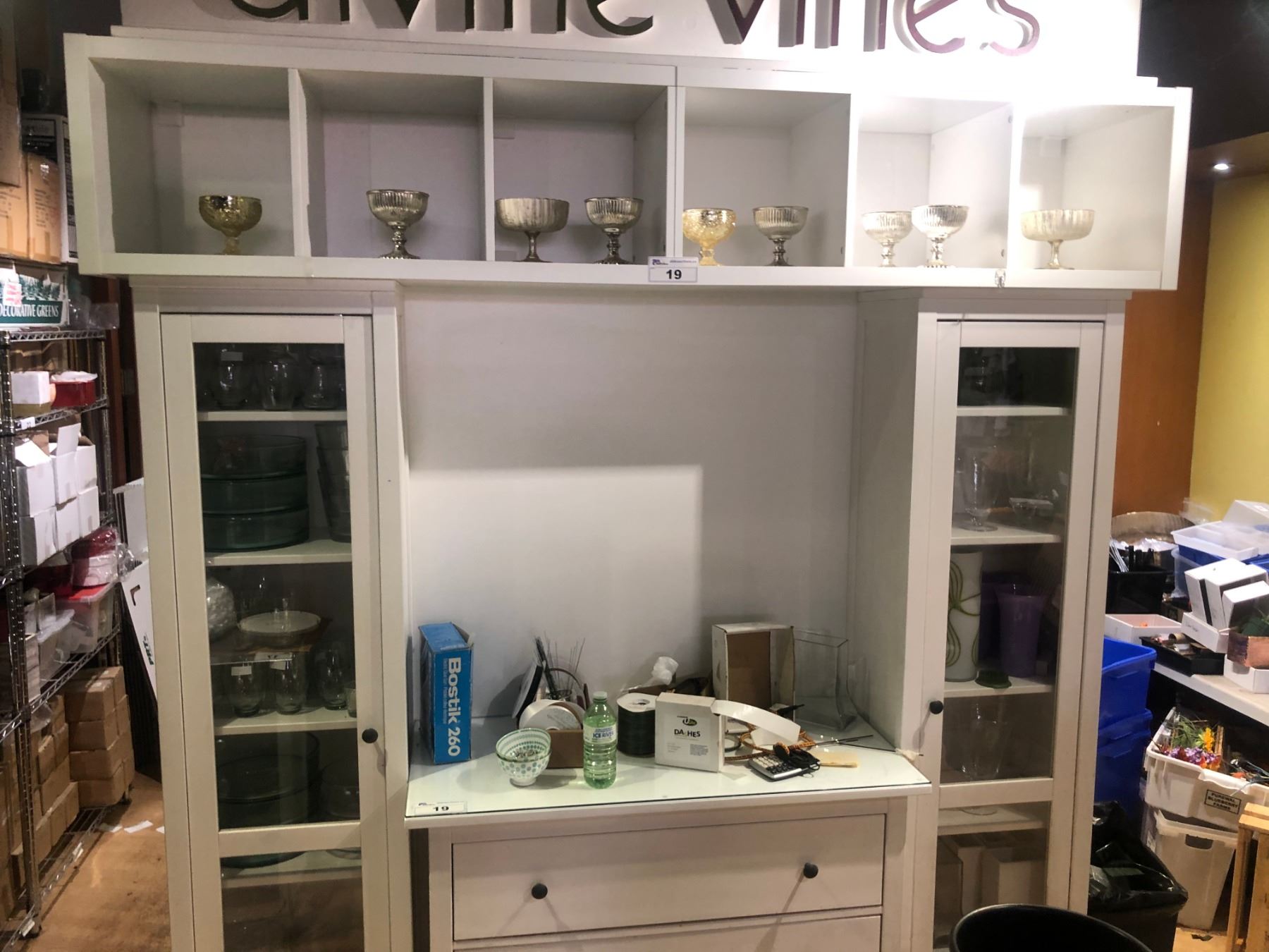 WHITE COUNTRY LOOK DISPLAY WITH 2 GLASS DOORS, DESK AND OVERSHELF