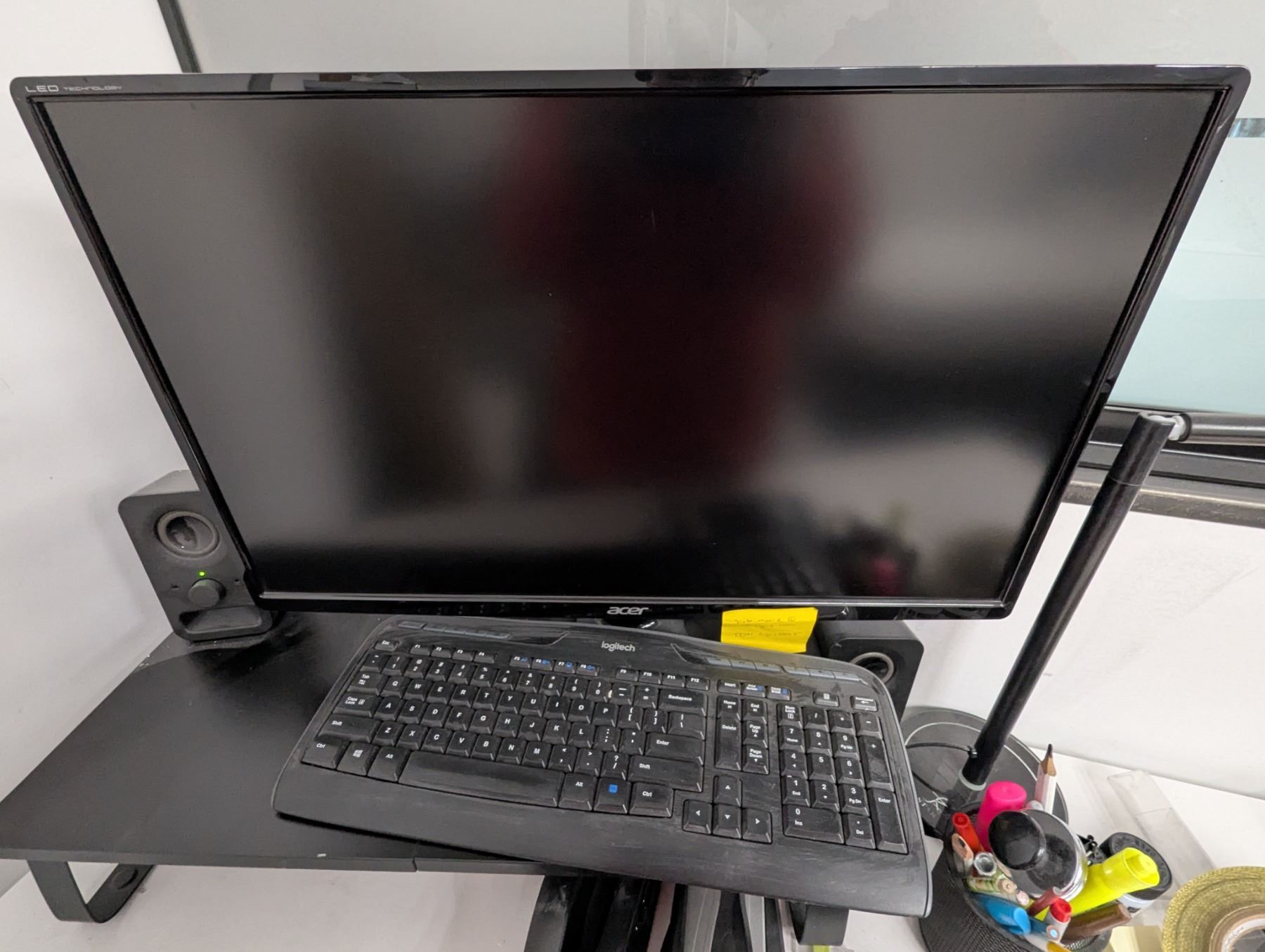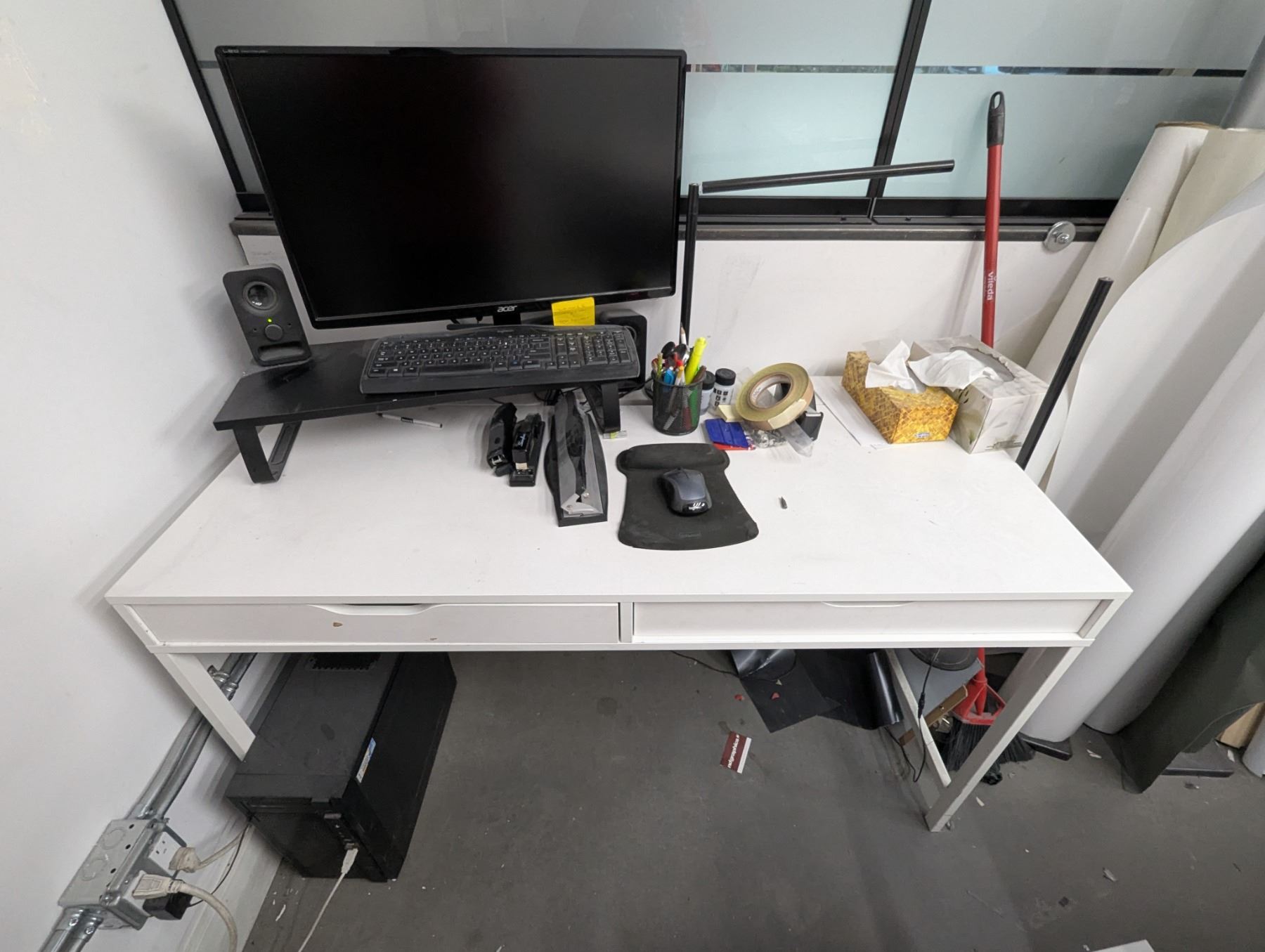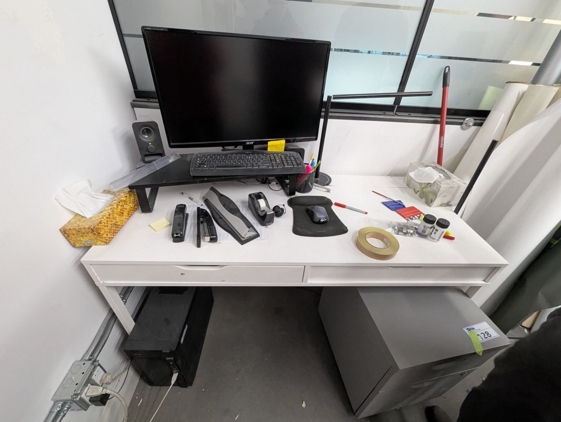 WHITE DESK WITH CONTENTS, COMPUTER, ACER MONITOR, WIRELESS KEYBOARD, WIRELESS MOUSE