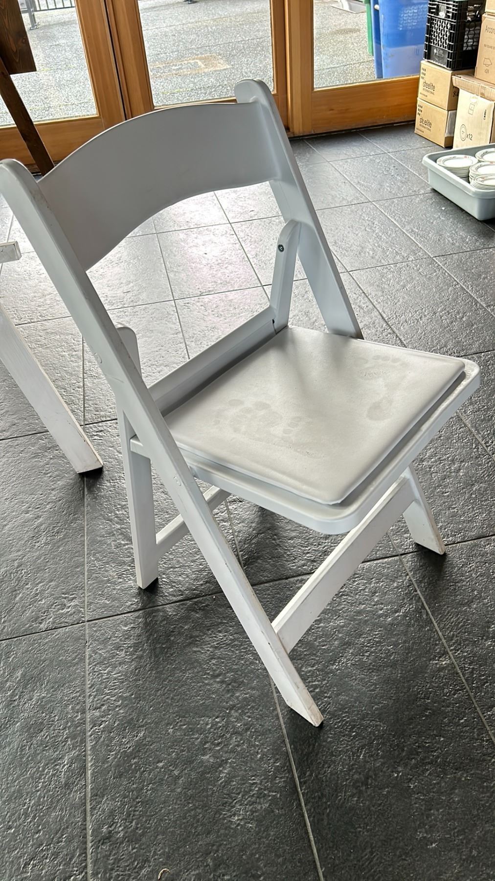 WHITE FOLDING BANQUETTE CHAIR, PLASTIC CONSTRUCTION, PADDED SEAT.