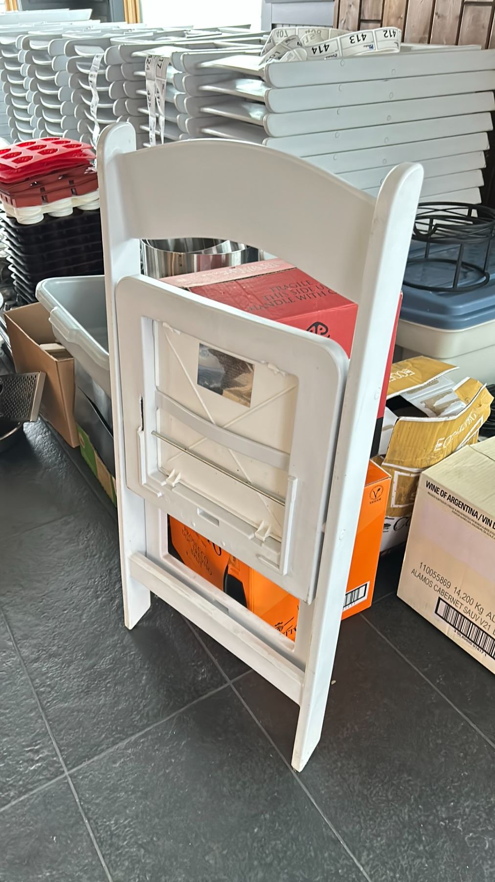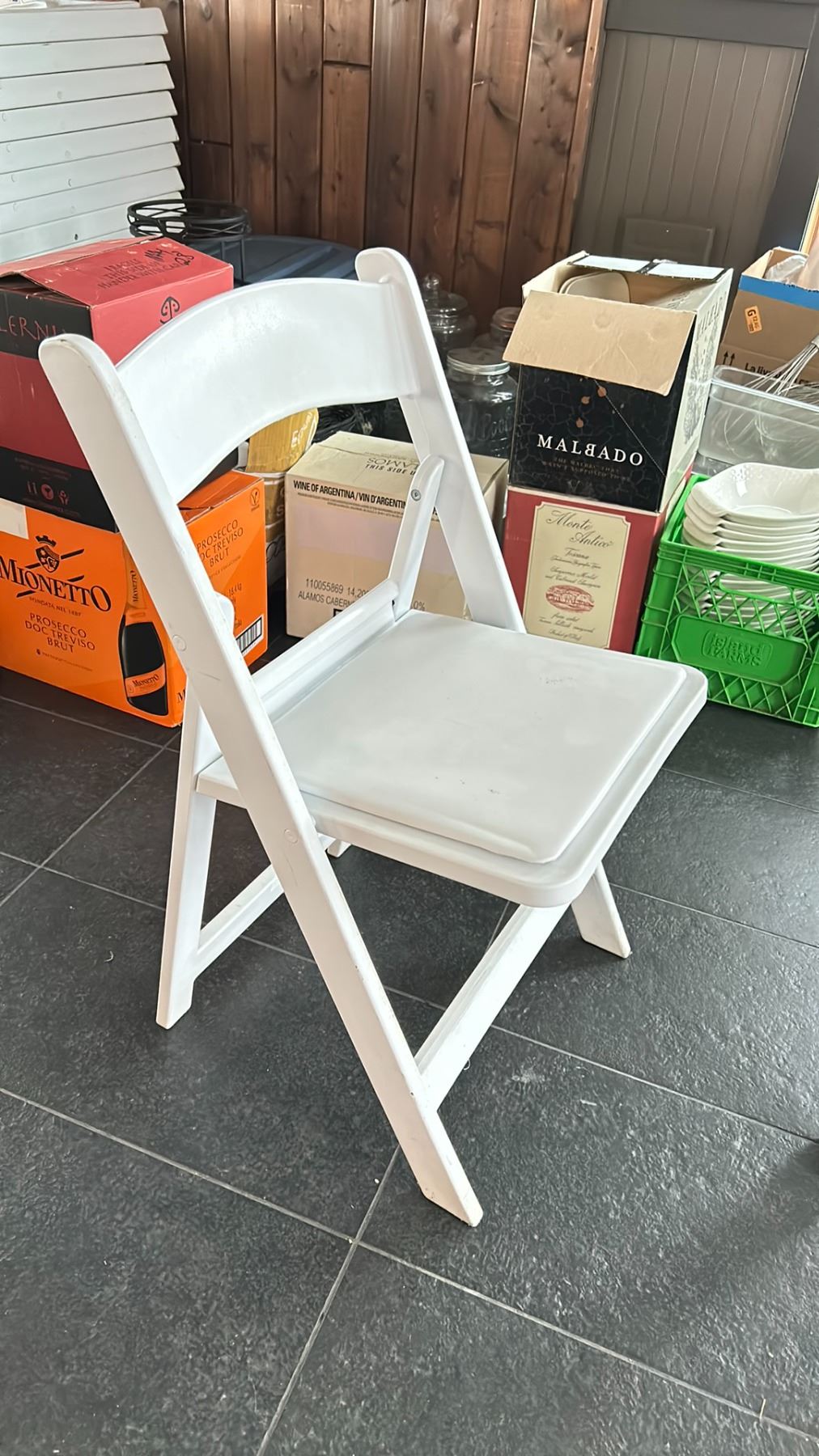 WHITE FOLDING BANQUETTE CHAIR, PLASTIC CONSTRUCTION, PADDED SEAT.