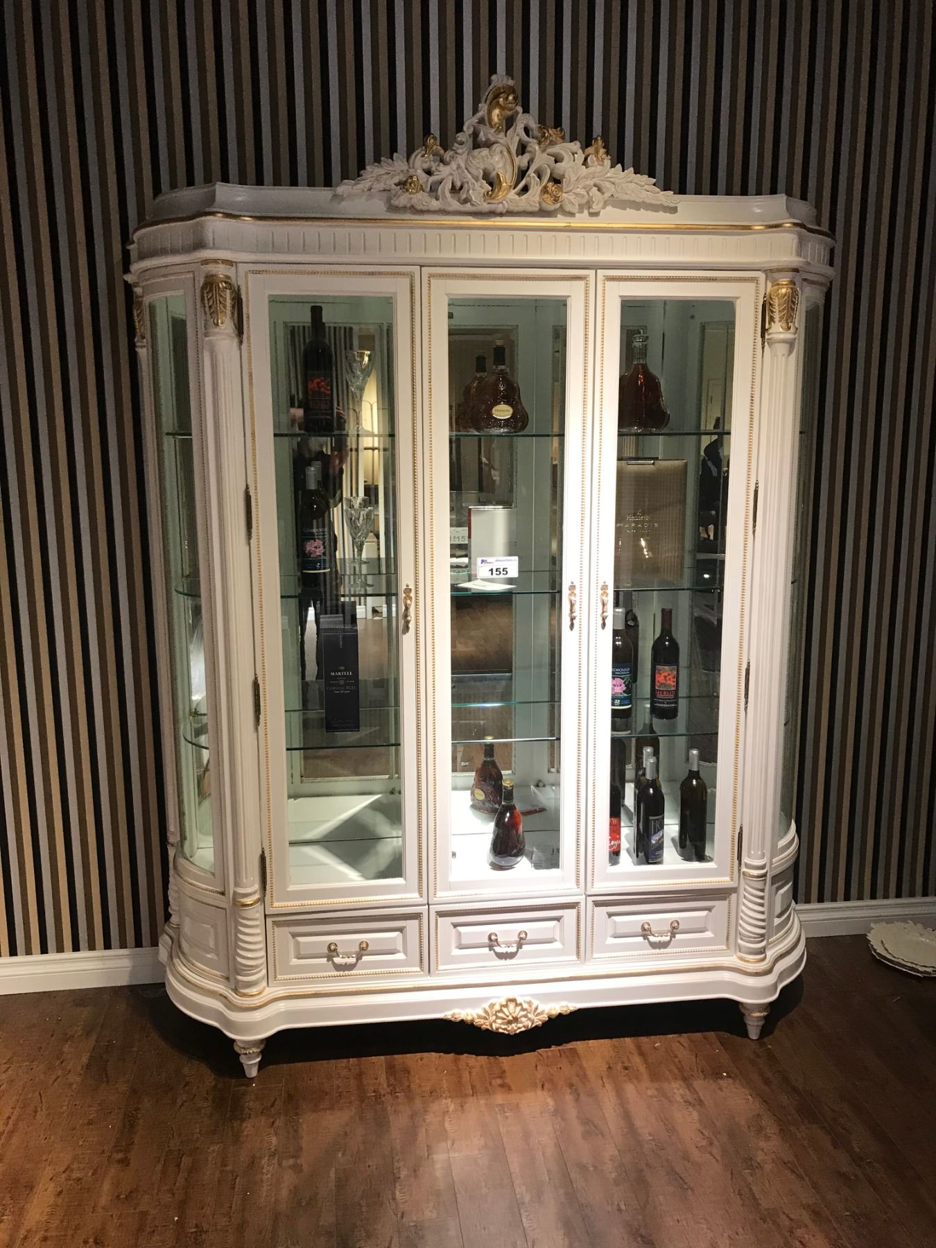 WHITE & GOLD FLOWER DESIGN 4 TIER, 3 DRAWER, 3 DOOR GLASS FRONT DISPLAY CABINET APPROX 17 X 70 X 85 INCHES