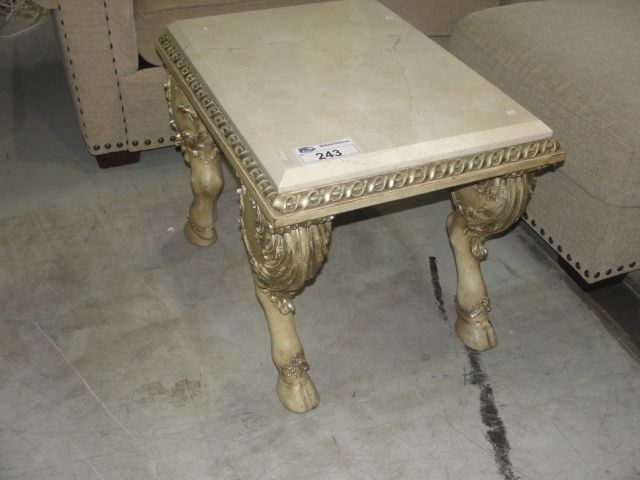 WHITE GRANITE TOP ELEGANT GUILD PAINTED SIDE TABLE WITH HORSE HOOF FEET