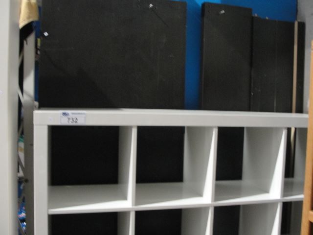 WHITE IKEA CUBBY HOLE SHELF UNIT AND QUEEN SIZE BED; HEADBOARD FOOTBOARD AND RAILS