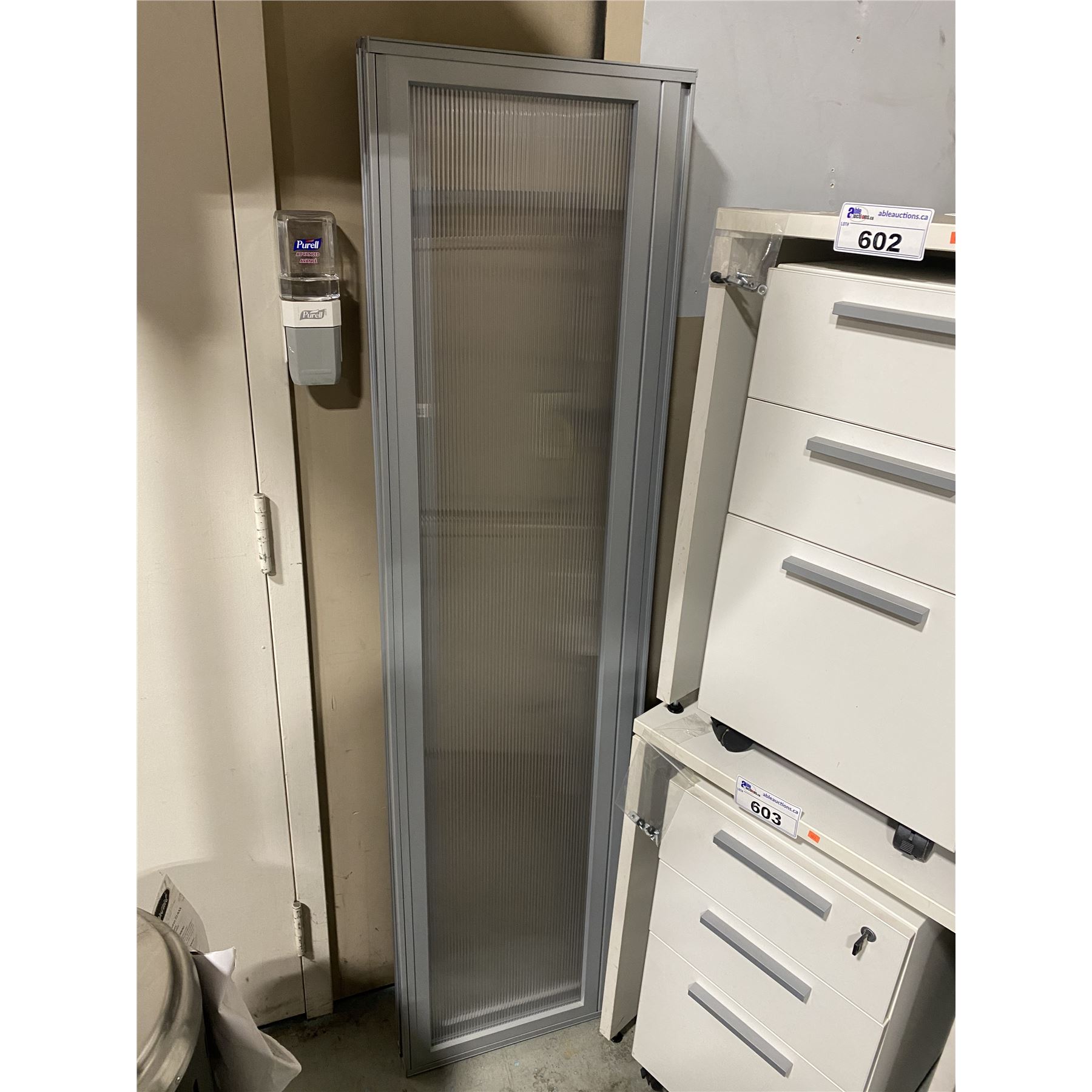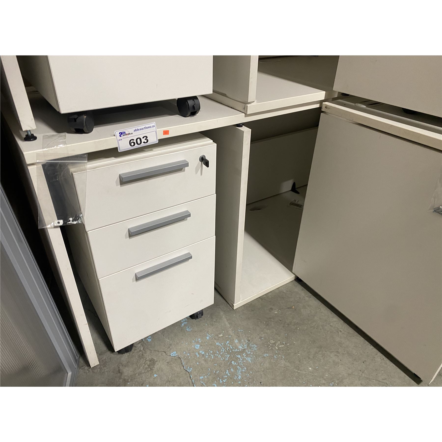 WHITE L-SHAPED EXECUTIVE DESK WITH 3 DRAWER MOBILE PEDESTAL AND PRIVACY SCREEN DESK SIZE 66"X24"X29" RETURN SIZE 42"X24"X29"