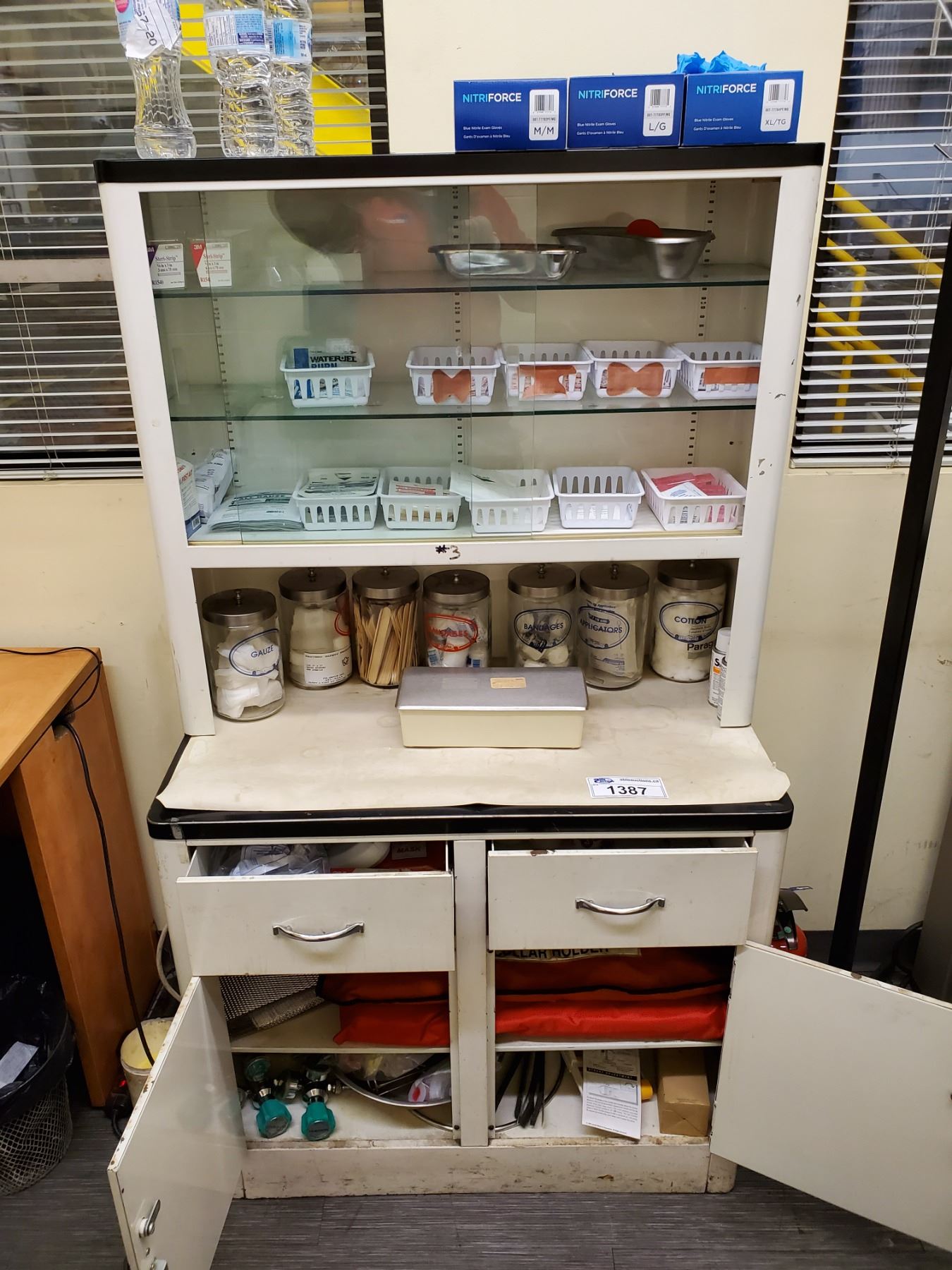 WHITE MEDICAL CABINET, INCLUDES ALL MEDICAL BANDAGES, TAPE, AND MORE 33"L X 17"W X 59"H