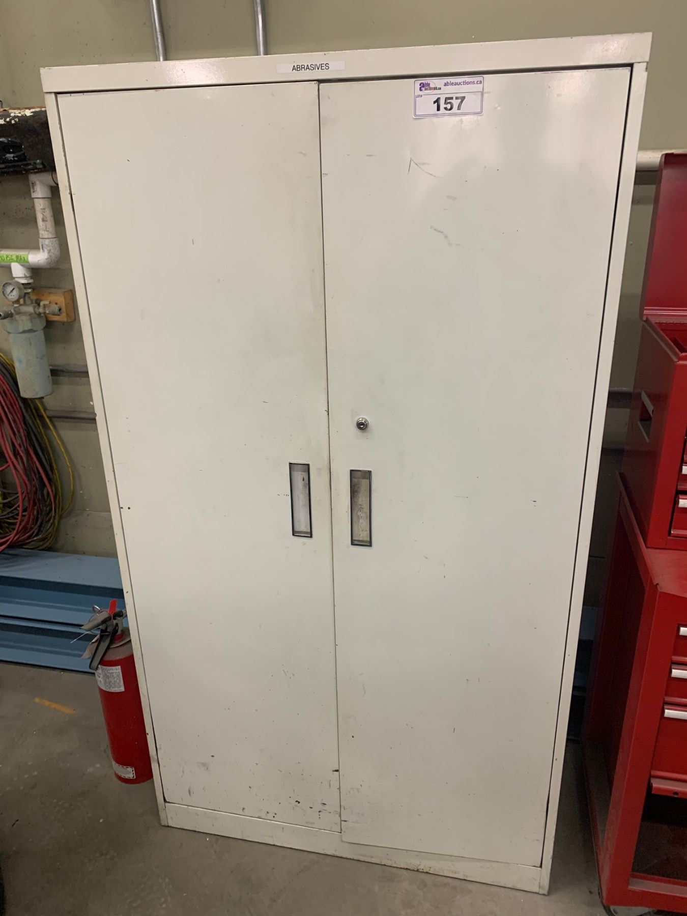 WHITE METAL 2 DOOR CABINET 65"H X 18"D X 36"W INCLUDES GRINDING DISCS, FLAT DISCS, SAND PAPER & MORE