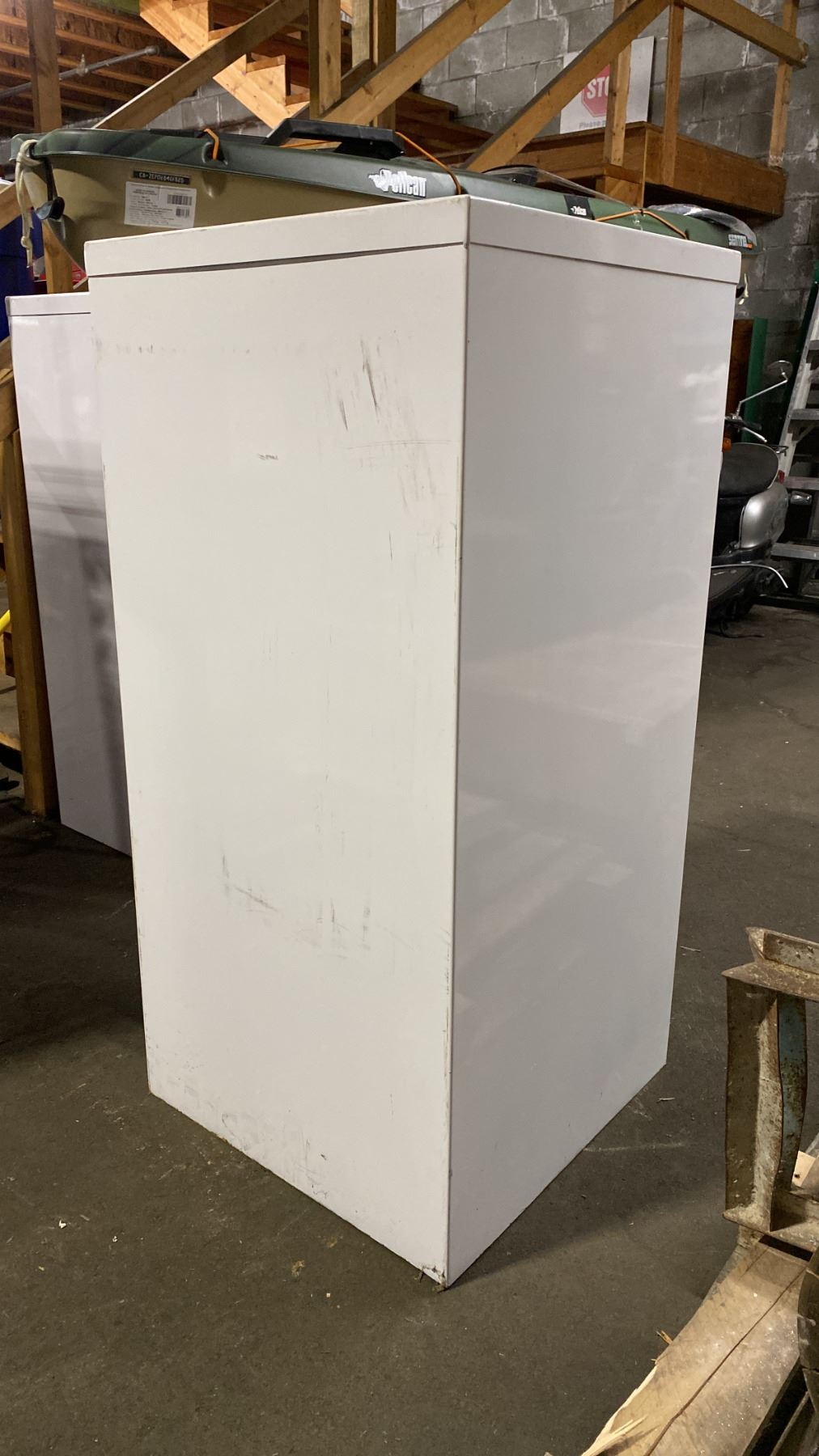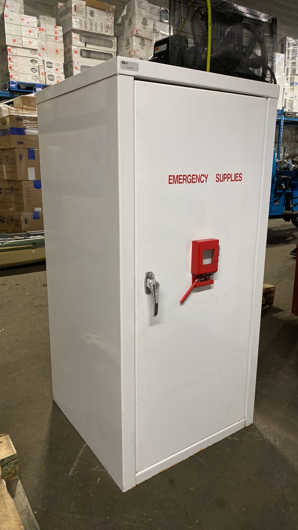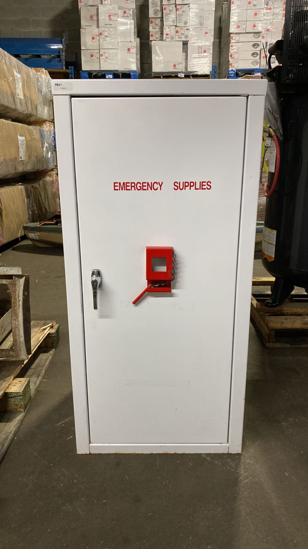 WHITE METAL SINGLE DOOR LOCKING EMERGENCY SUPPLIES CABINET WITH KEY APPROX 23"W X 23"D X 48"H