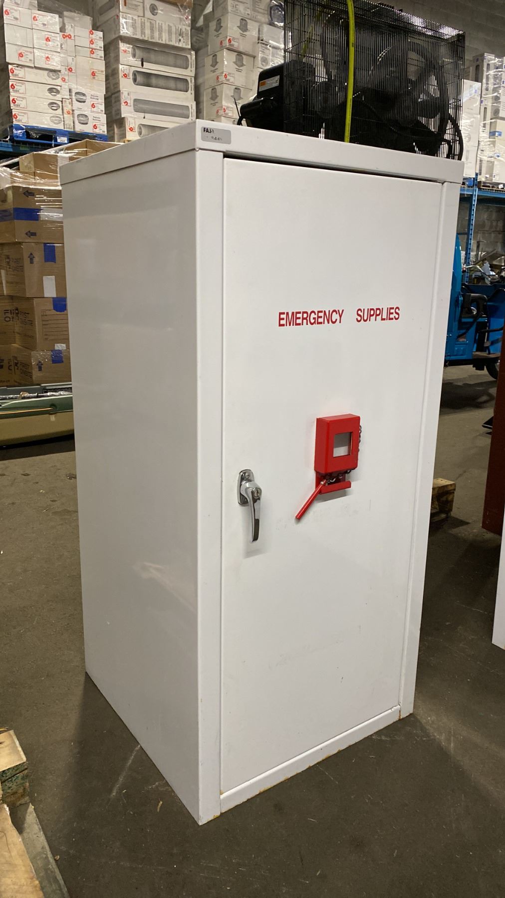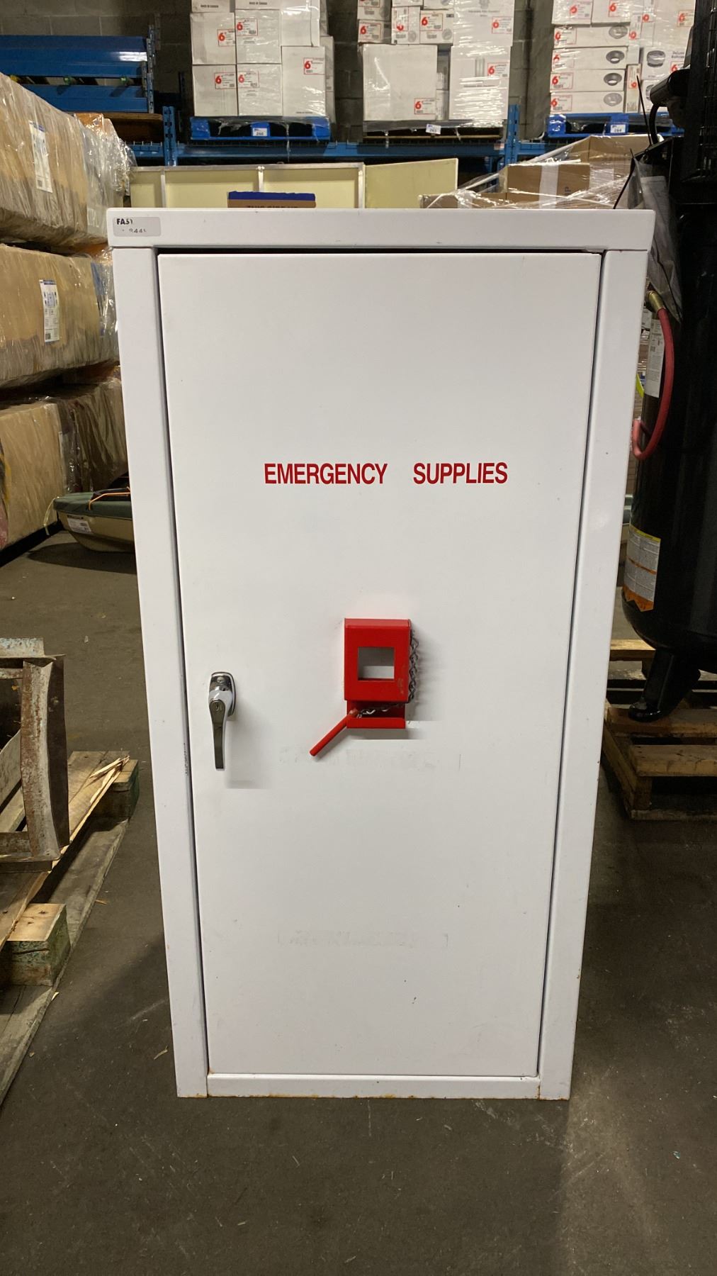 WHITE METAL SINGLE DOOR LOCKING EMERGENCY SUPPLIES CABINET WITH KEY APPROX 23"W X 23"D X 48"H