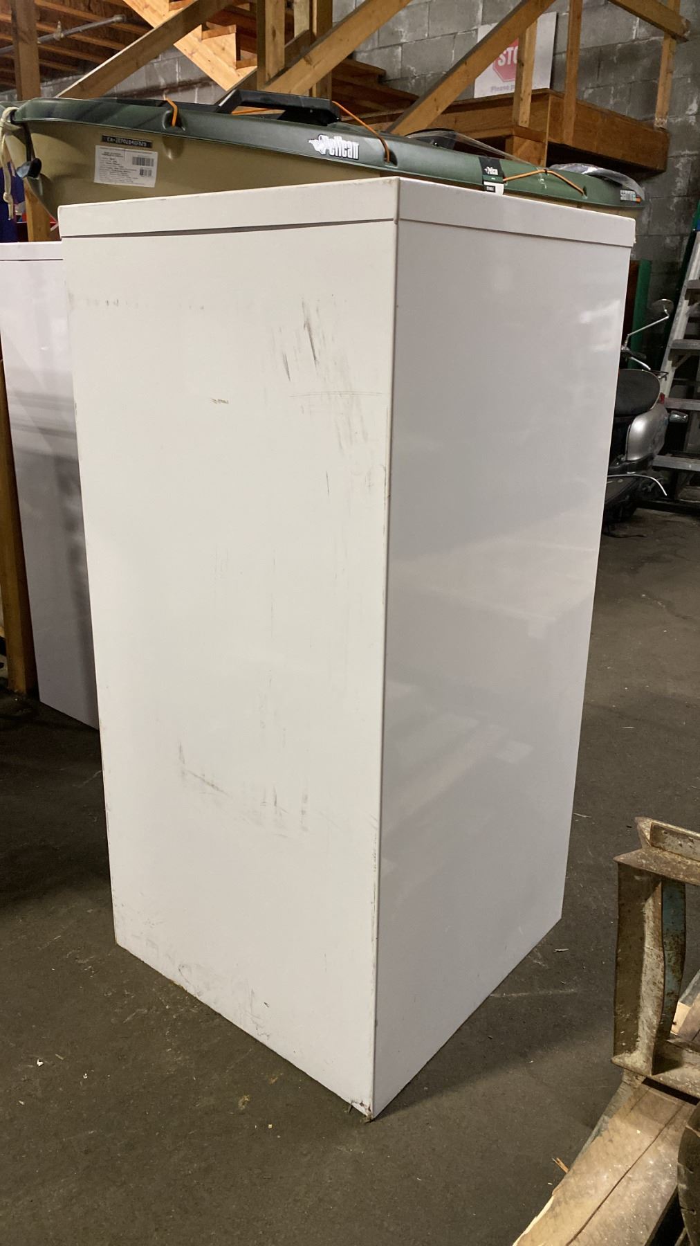 WHITE METAL SINGLE DOOR LOCKING EMERGENCY SUPPLIES CABINET WITH KEY APPROX 23 W X 23 D X 48 H