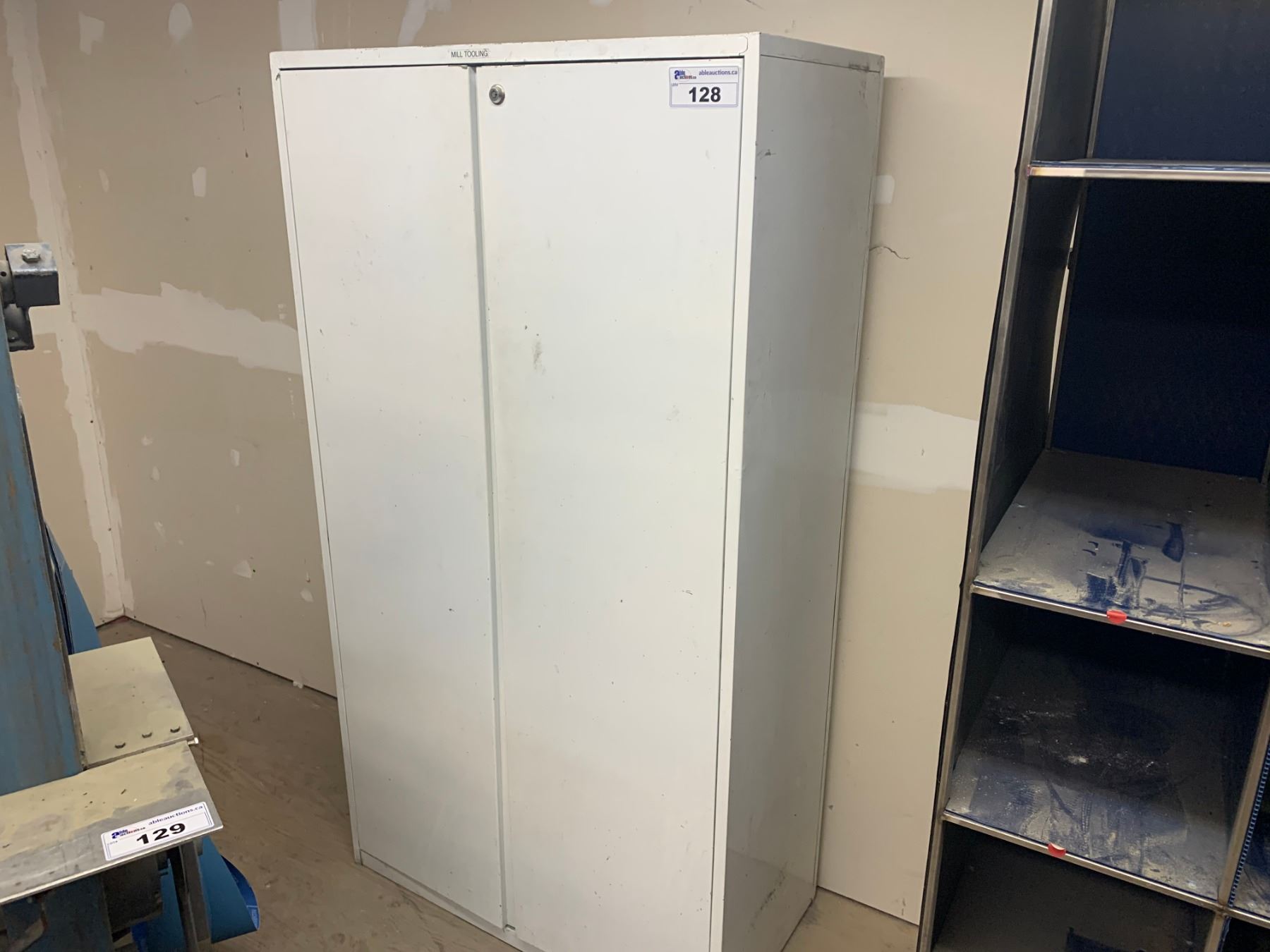 WHITE METAL TOOL CABINET WITH DRILL BITS & BLACK / BLUE 15 SLOT ORGANIZER SHELF