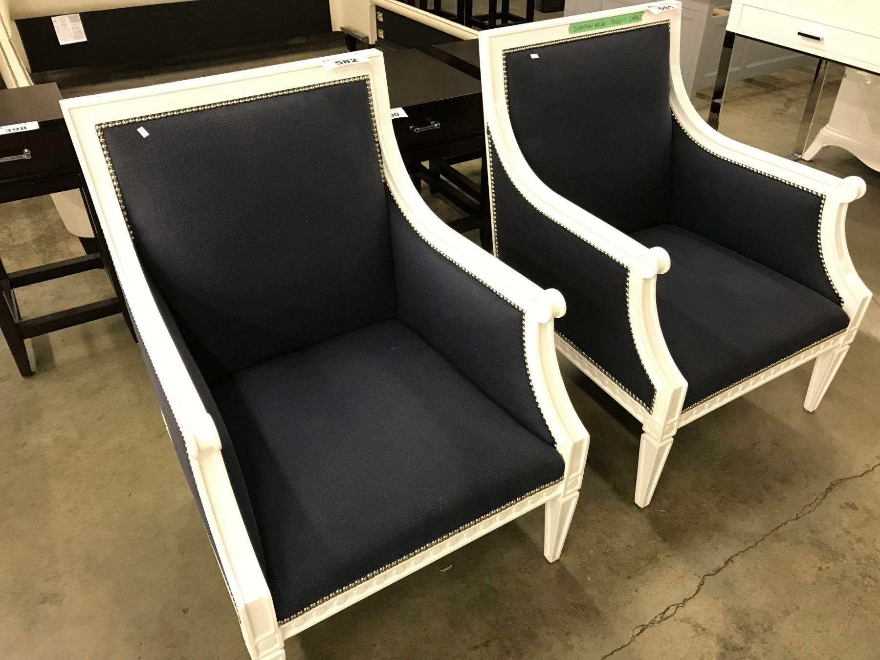 WHITE & NAVY STUDDED JONATHAN ADLER REGENT ARM CHAIR
