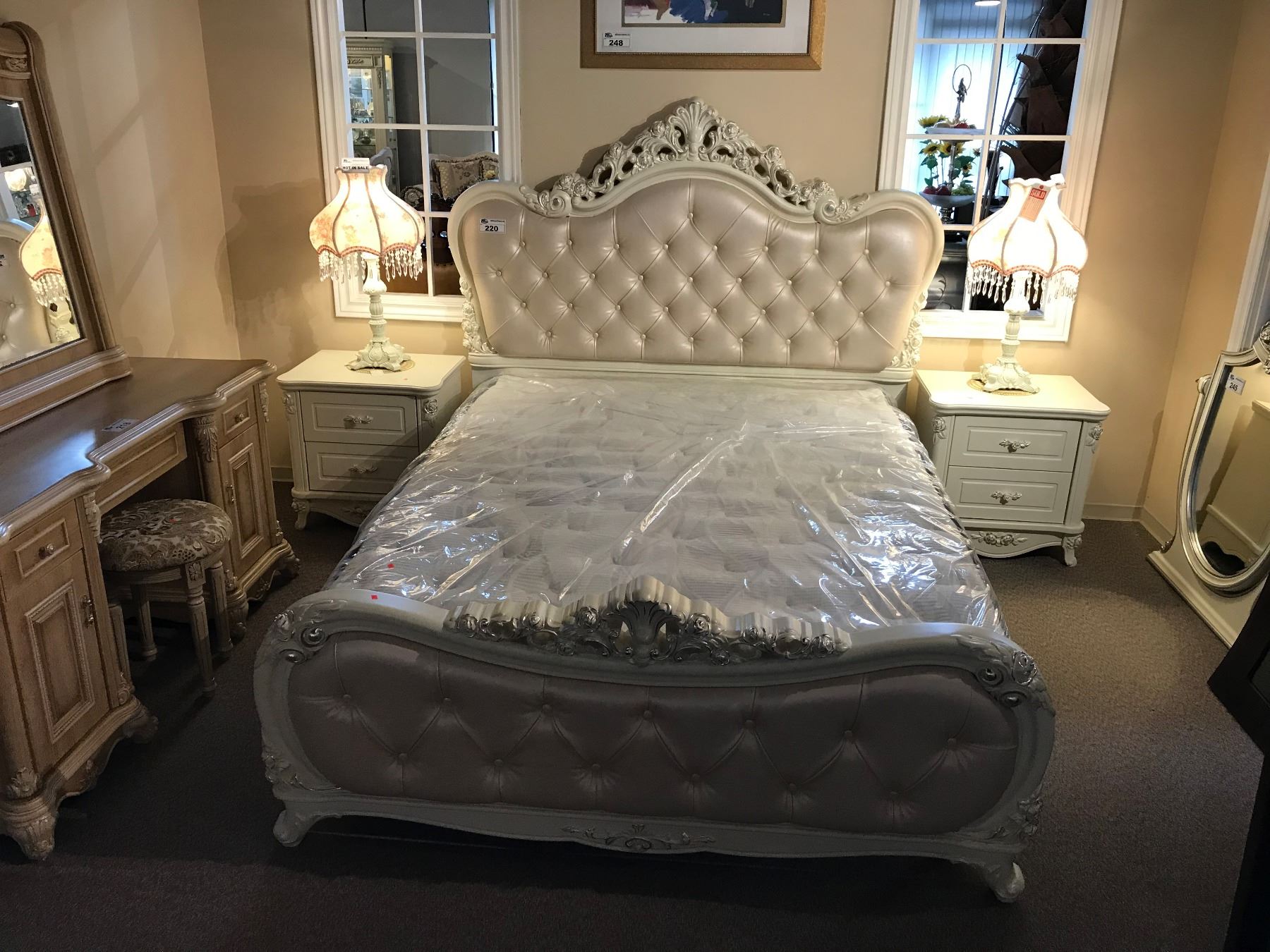 WHITE ORNATE WOOD QUEEN SIZE BEDROOM SUITE WITH QUEEN BED, MATTRESS & 2 NIGHT STANDS