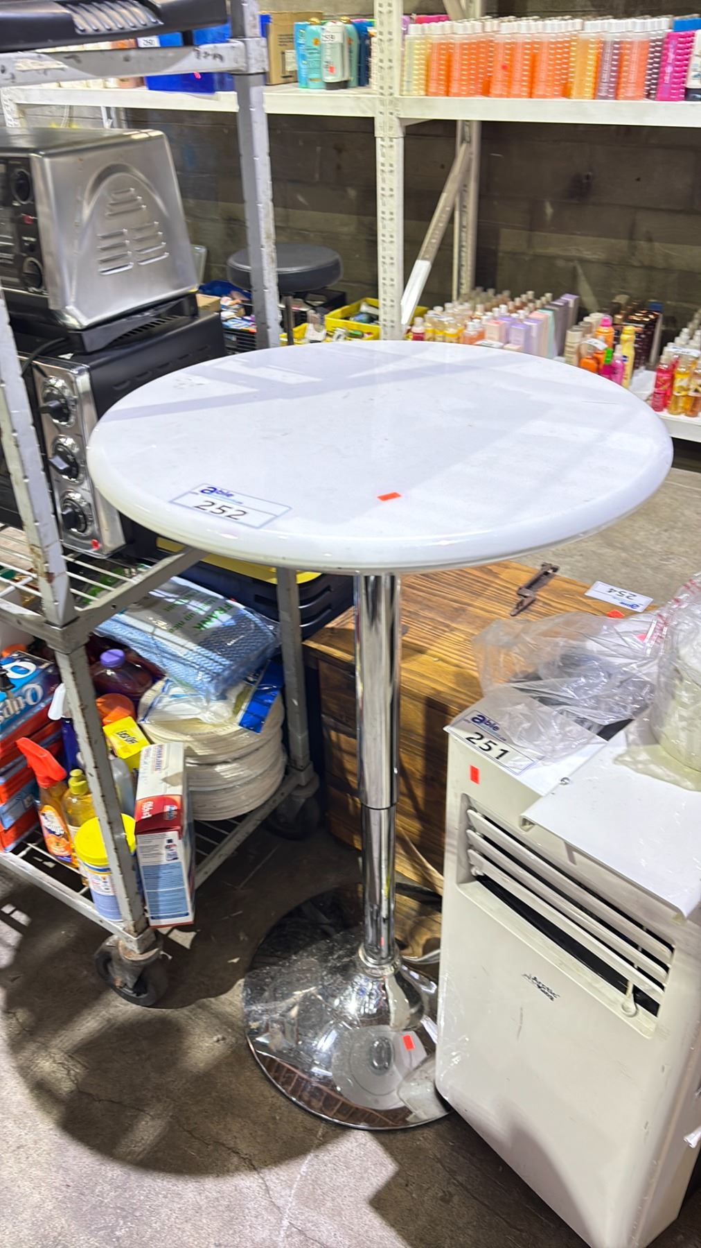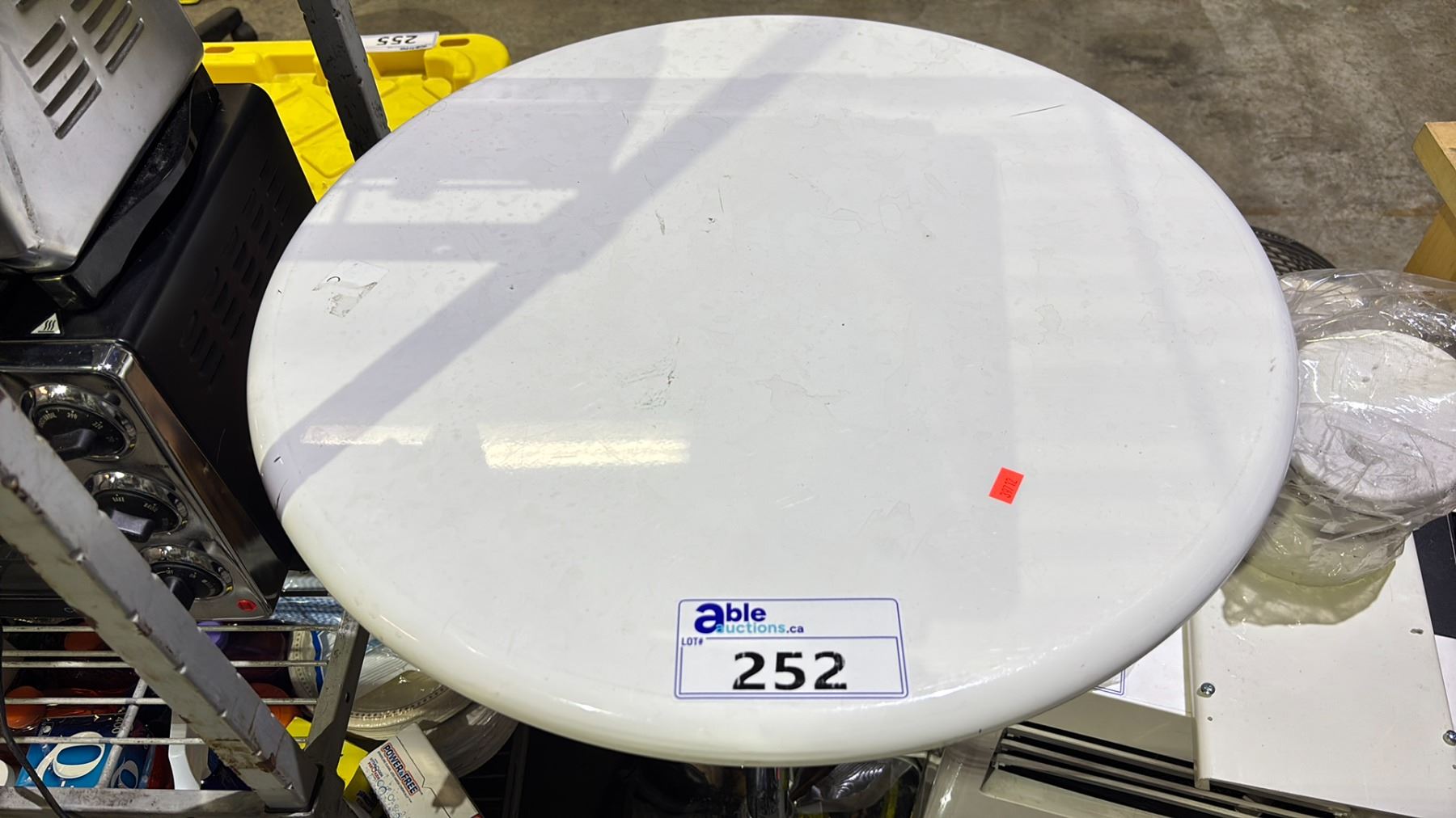 WHITE PLASTIC ADJUSTABLE ROUND SIDE TABLE WITH CHROME BASE