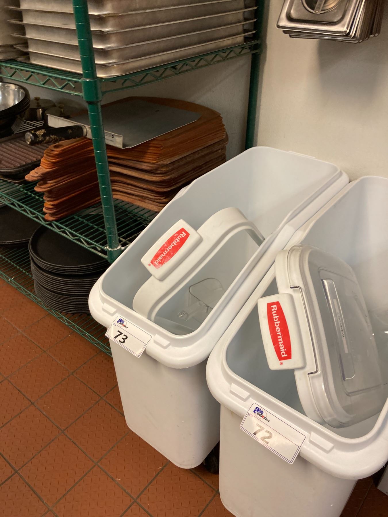 WHITE RUBBERMAID MOBILE COMMERCIAL DRY GOODS BIN WITH LID & SCOOP
