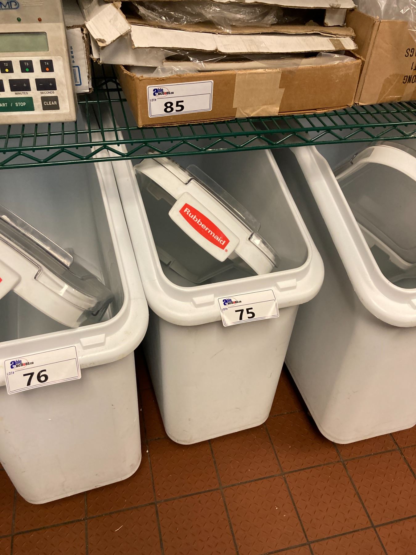 WHITE RUBBERMAID MOBILE COMMERCIAL DRY GOODS BIN WITH LID & SCOOP