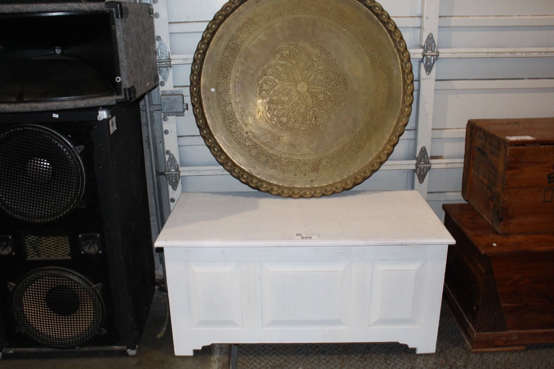 WHITE STORAGE TRUNK AND LARGE ROUND PLATTER