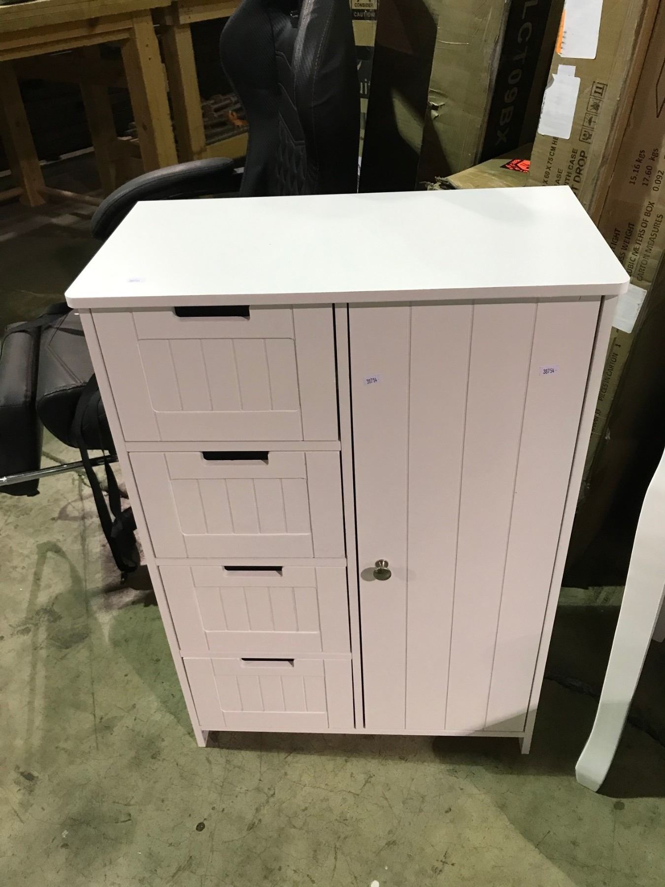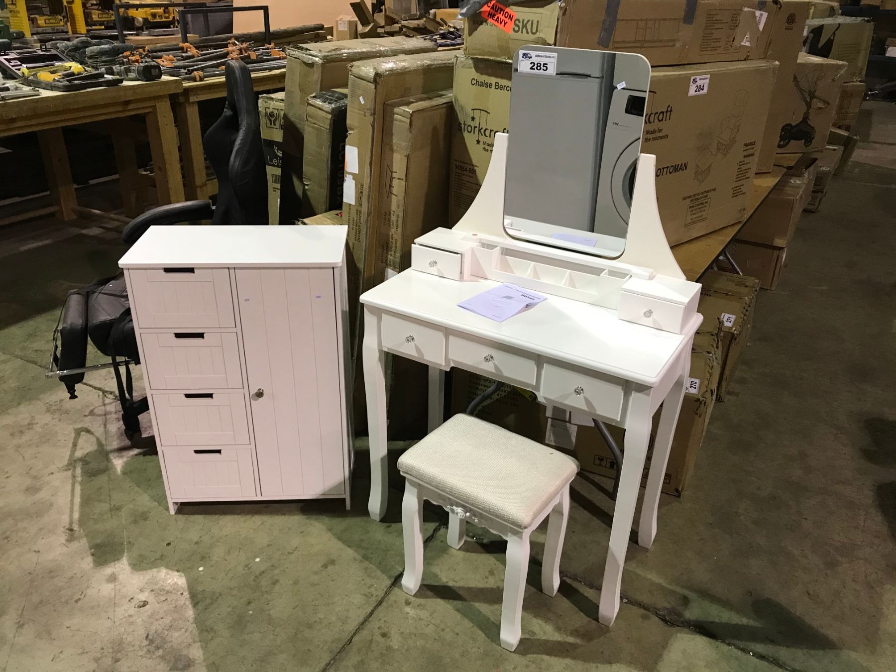 WHITE VASAGLE CHILD VANITY WITH STOOL & SINGLE DOOR 4 DRAWER CABINET DIMENSIONS: VANITY 16"D X 32"W X 53"H, CABINET 12"D X 22 1/2"W X 33"H