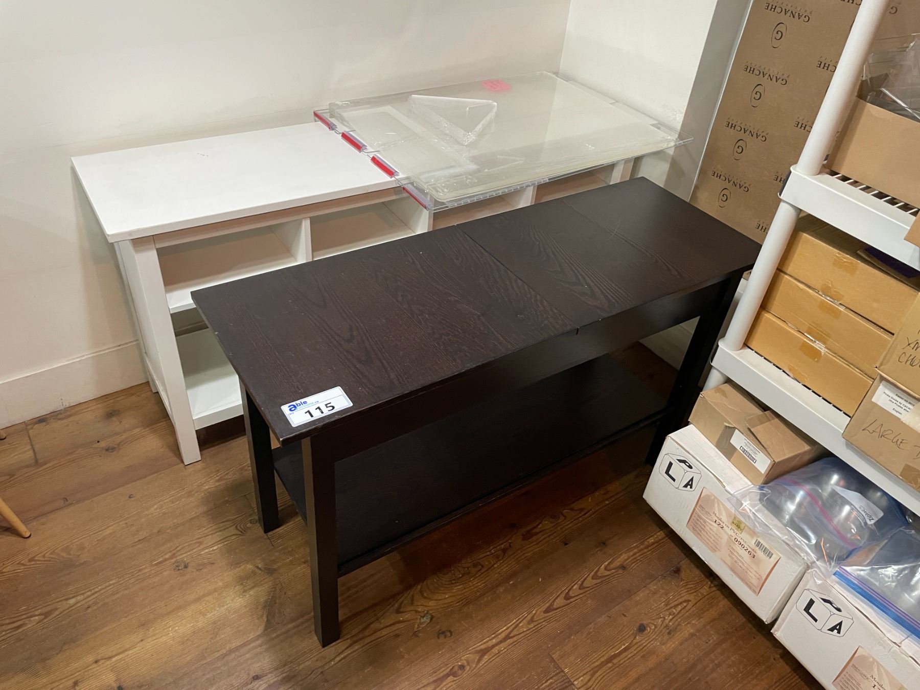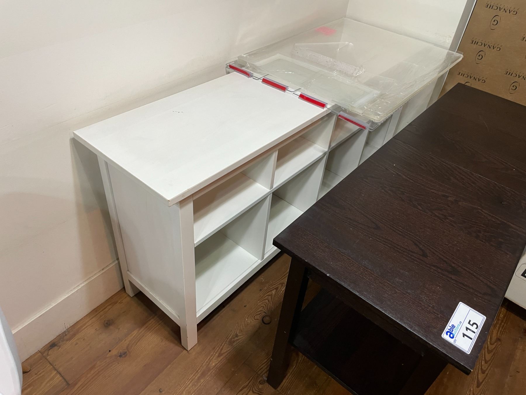 WHITE WOOD STORAGE DISPLAY COUNTER, DARK WOOD STORAGE DISPLAY COUNTER, & PLASTIC DIVIDER SCREENS