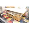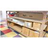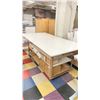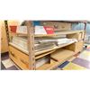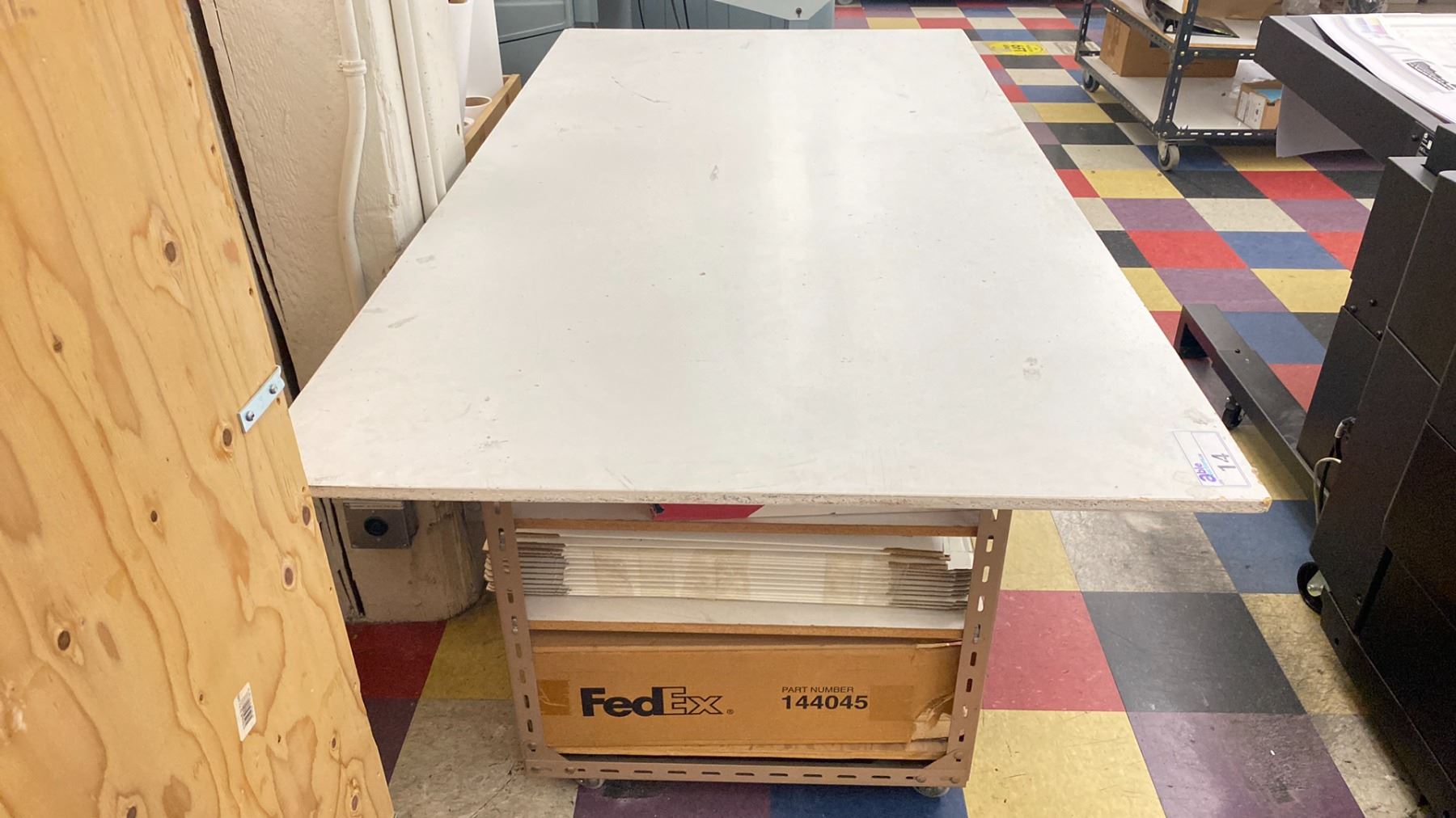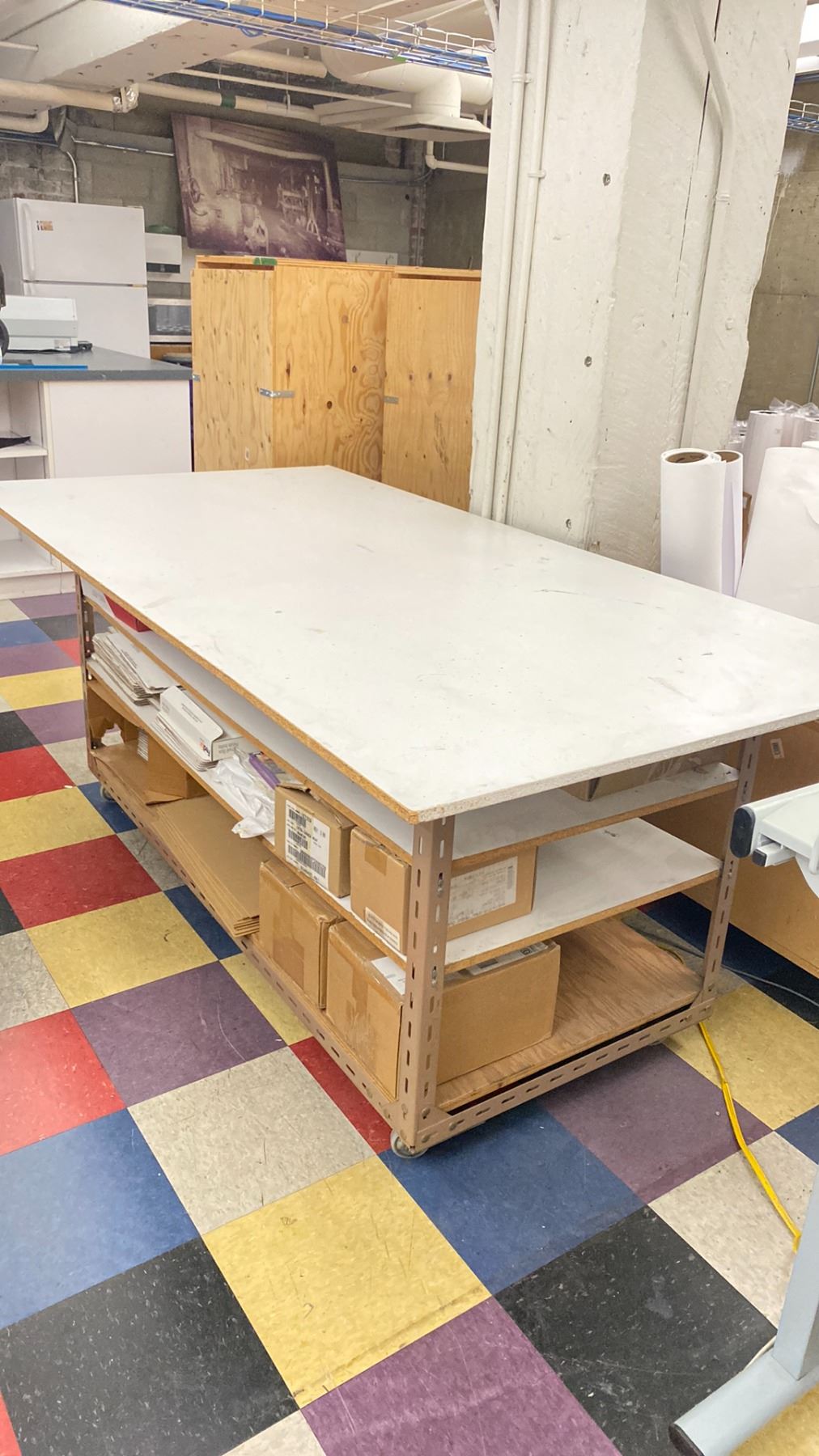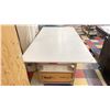 WHITE WOODEN / METAL 78"W X 40"D X 32"H COMMERCIAL MOBILE LAYOUT TABLE WITH ASSORTED PRINT SHOP CONTENTS