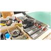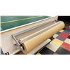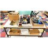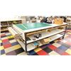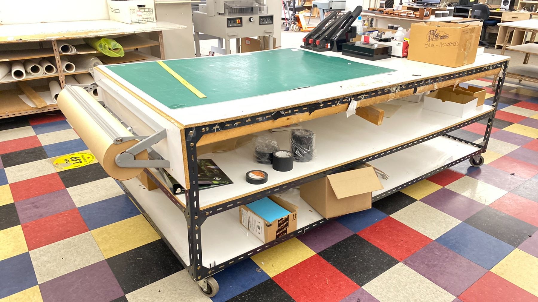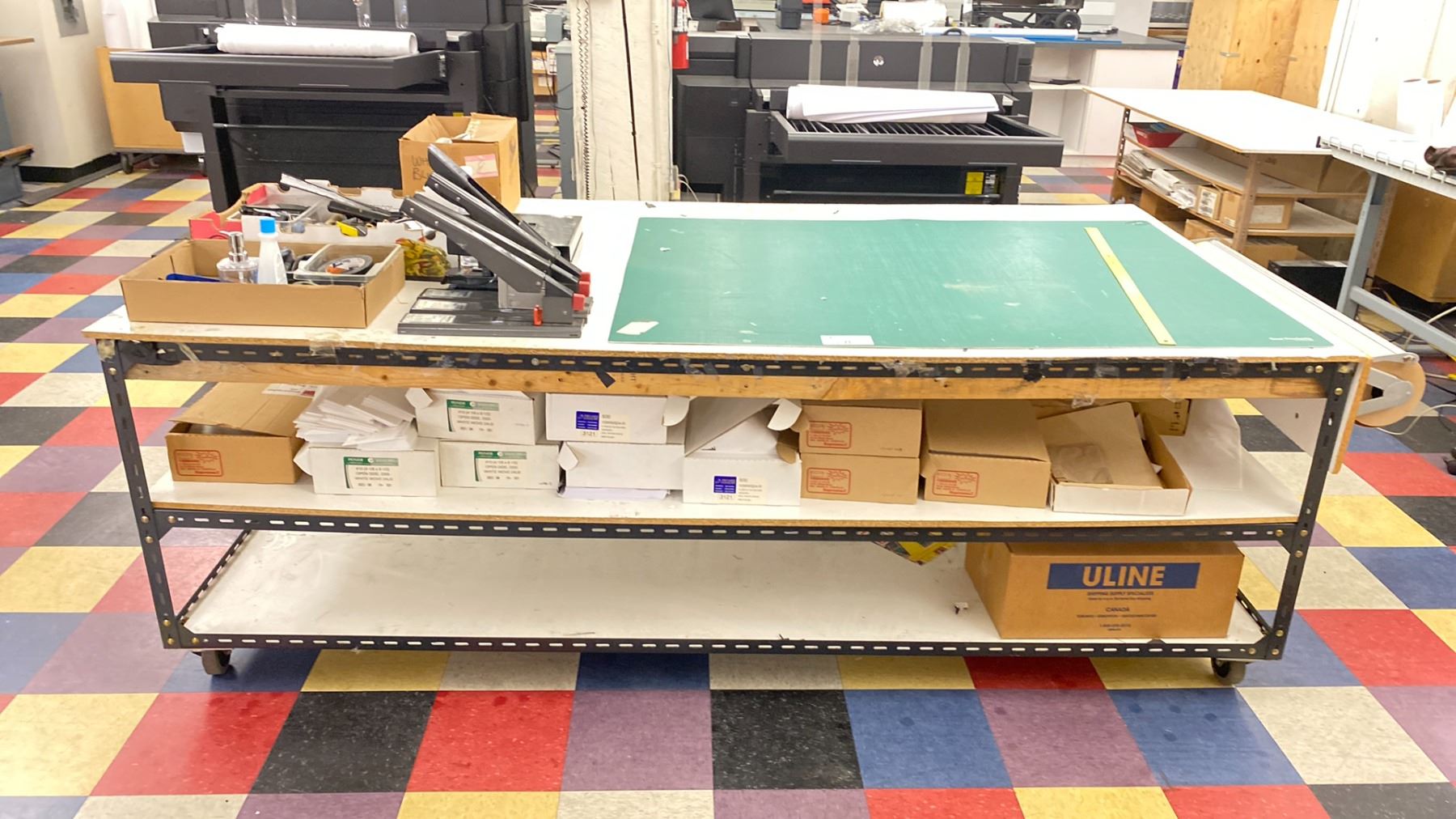 WHITE WOODEN / METAL 97"W X 49"D X 33 1/2"H COMMERCIAL MOBILE LAYOUT TABLE WITH ASSORTED PRINT SHOP CONTENTS