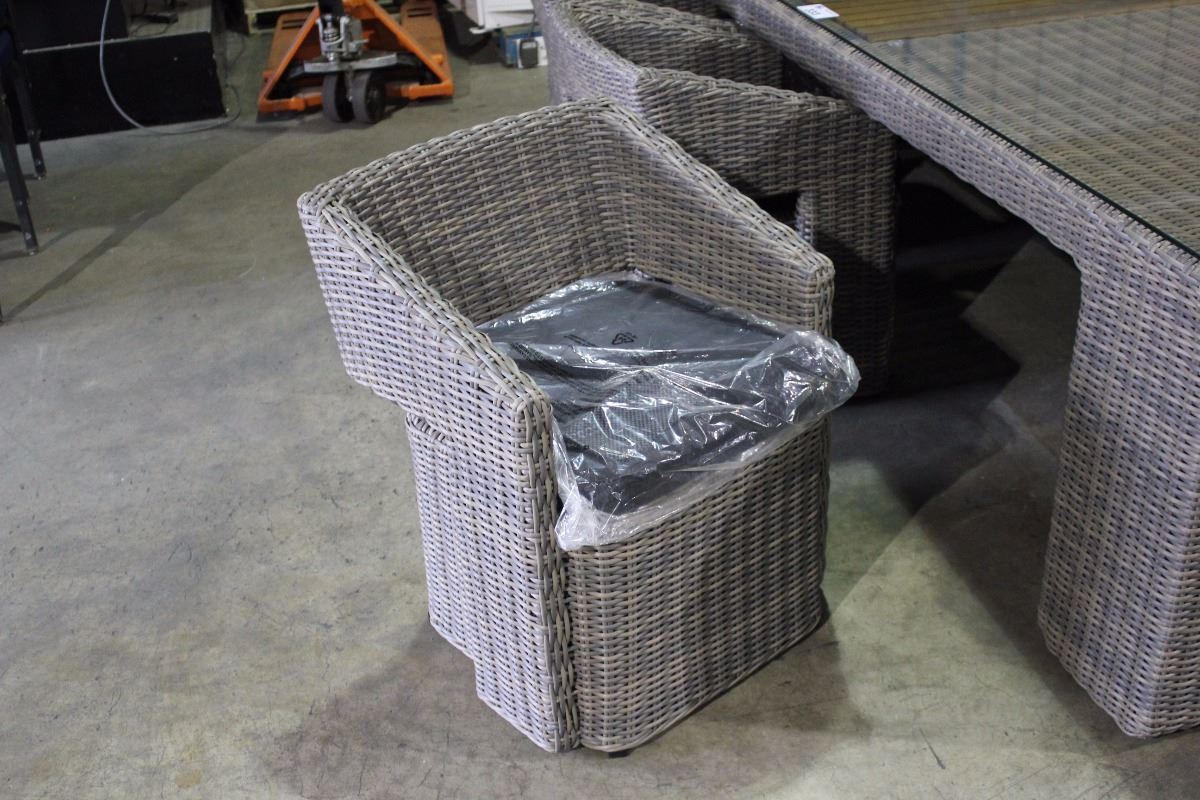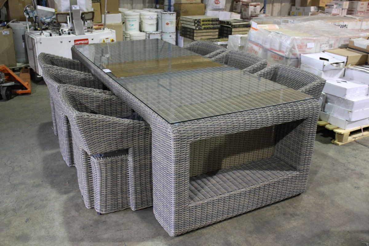 WICKED WICKER GREY WOVEN & BLACK WOOD INLAYED TOP OUTDOOR DINING SET INCLUDING: TABLE & 6 CHAIRS (8 BOXES)
