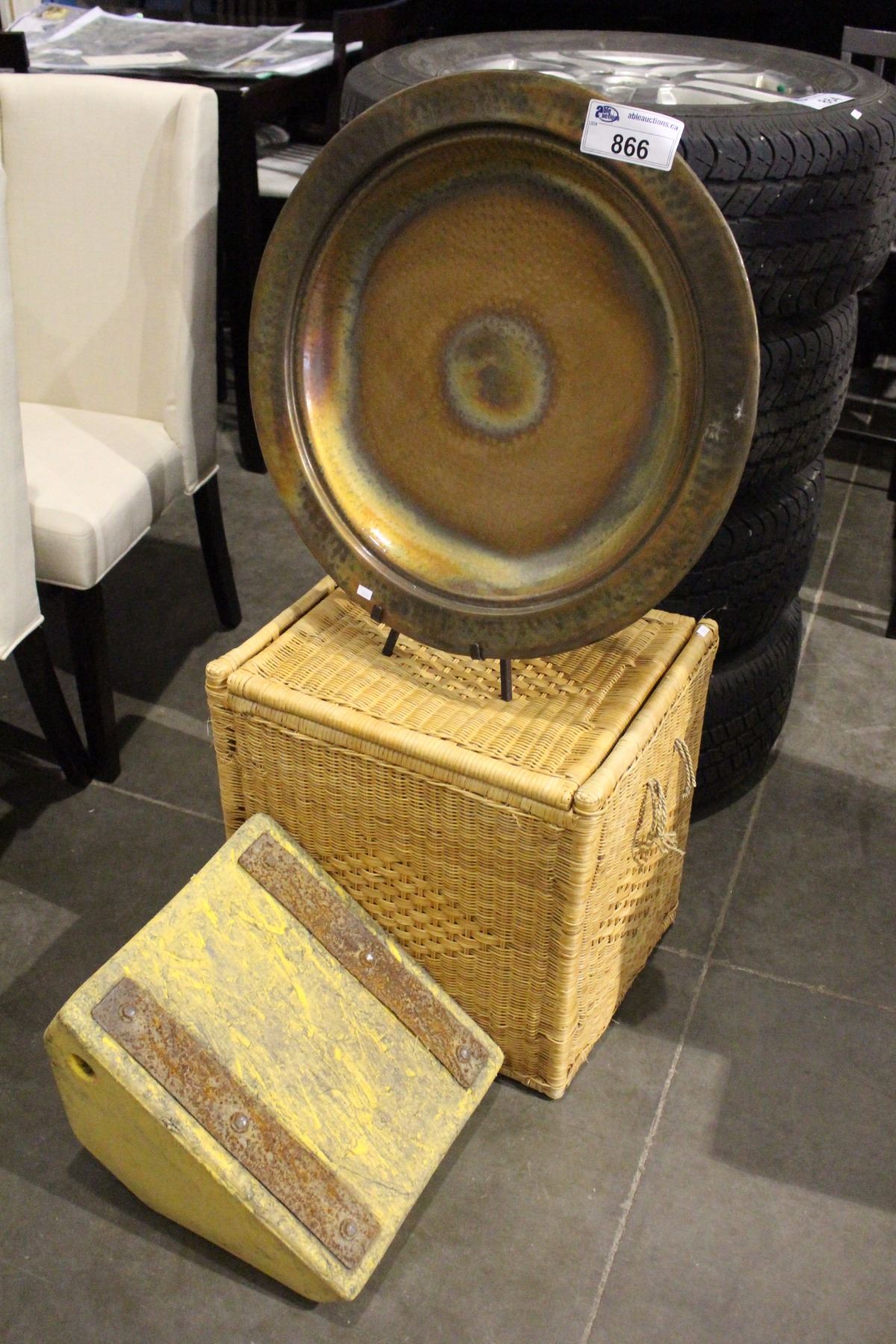 WICKER HAMPER, WHEEL BLOCK, LARGE COPPER PLATE