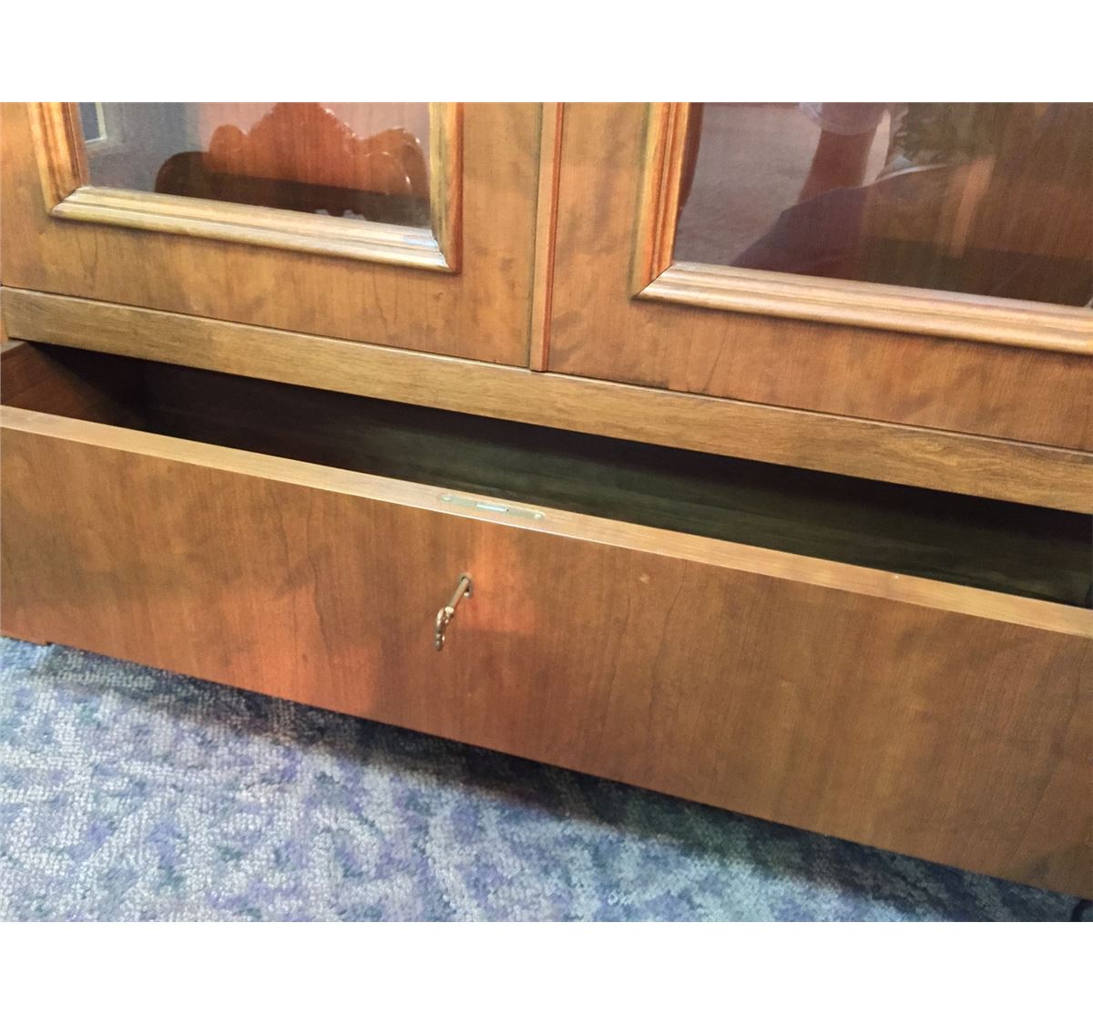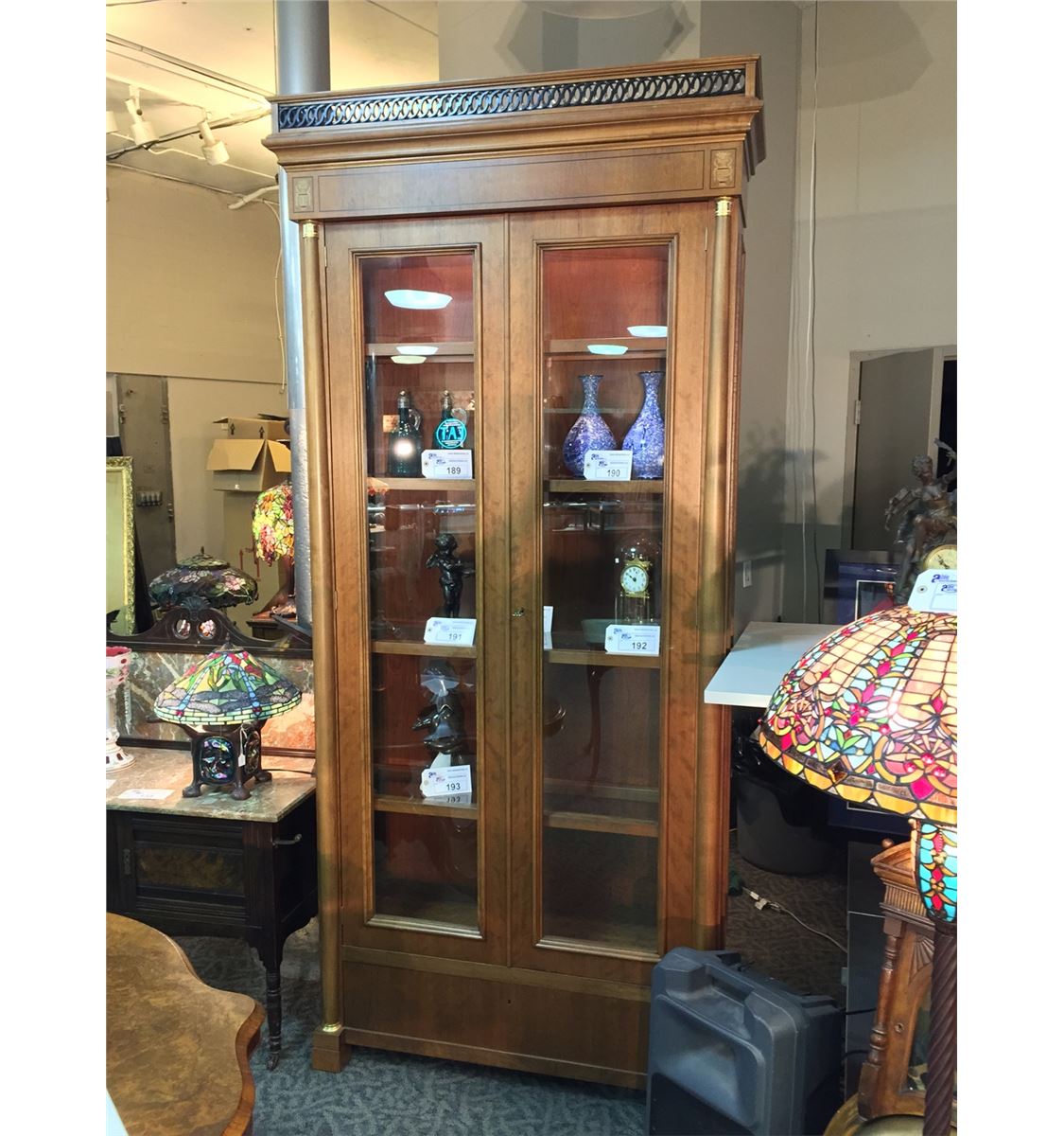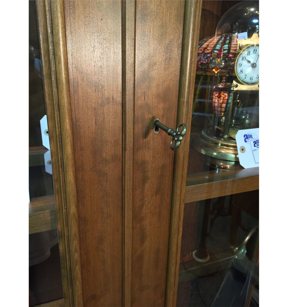 WILLIAM SWITZER GLASS DOOR DISPLAY CASE, 4 GLASS SHELVES WITH KEY, IN EXCELLENT CONDITION 99" H X 44" W X 15" D