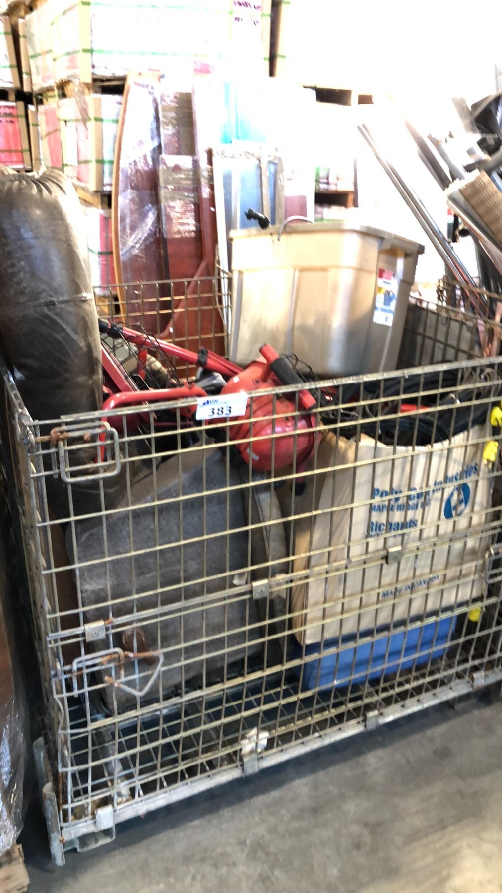 WIRE CRATE INCLUDING WORK LIGHTS, LINEAR AIR PUMP, PROPANE HEATER, EXTENSION CABLES, CAMPING CHAIRS, AND MORE -MUST TAKE ALL-