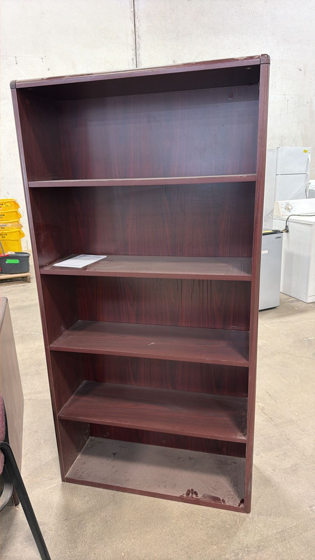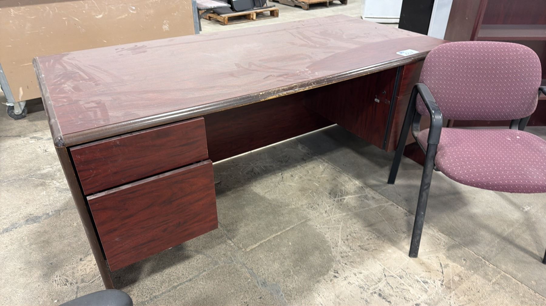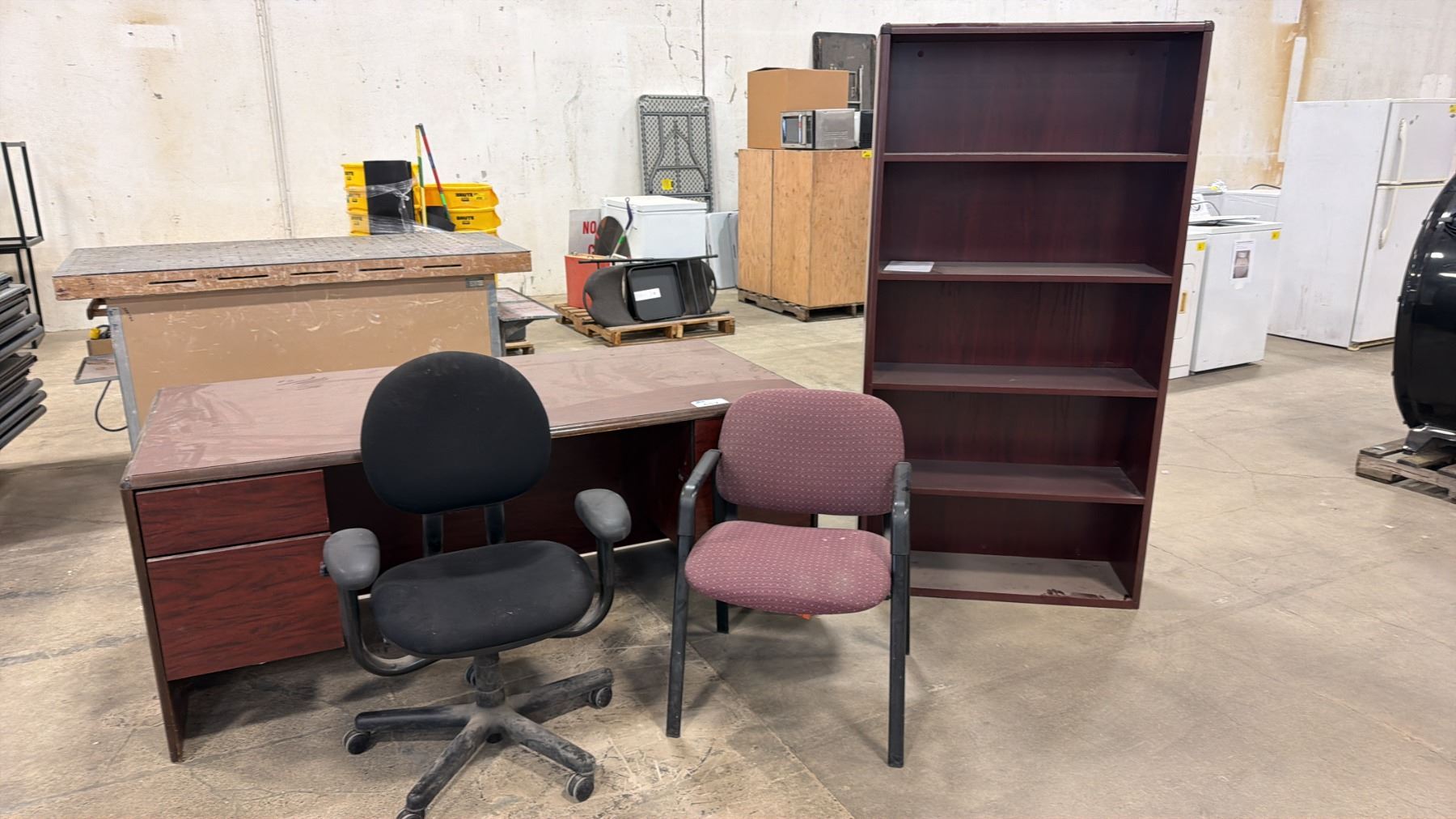 WOOD 2-DRAWER DESK WITH BOOKSHELF, ROLLING OFFICE CHAIR & OFFICE CHAIR