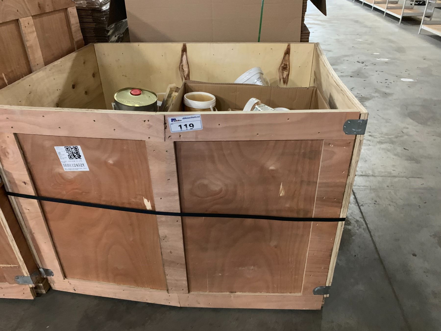 WOOD 38" X 40" STORAGE CRATE WITH CONTENTS POLYAMIDE CURING AGENT AND MORE