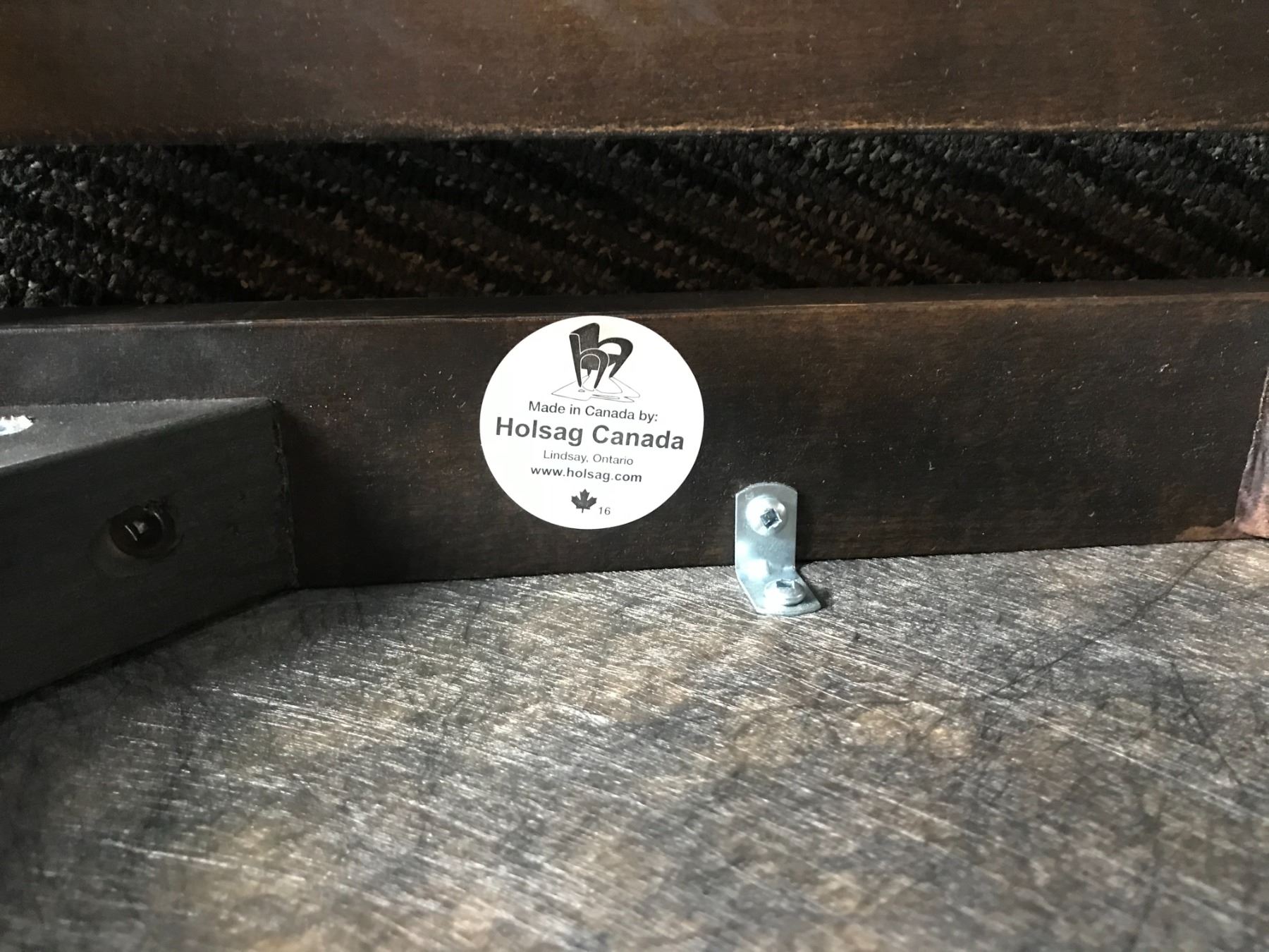 WOOD AND RED UPHOLSTERED CHAIR. HOLSAG CANADA BRAND- MADE IN CANADA