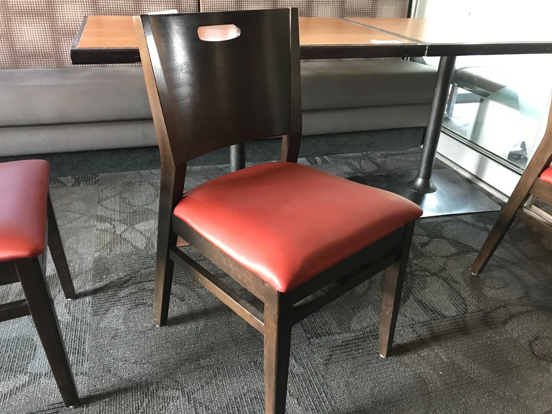 WOOD AND RED UPHOLSTERED CHAIR. HOLSAG CANADA BRAND- MADE IN CANADA