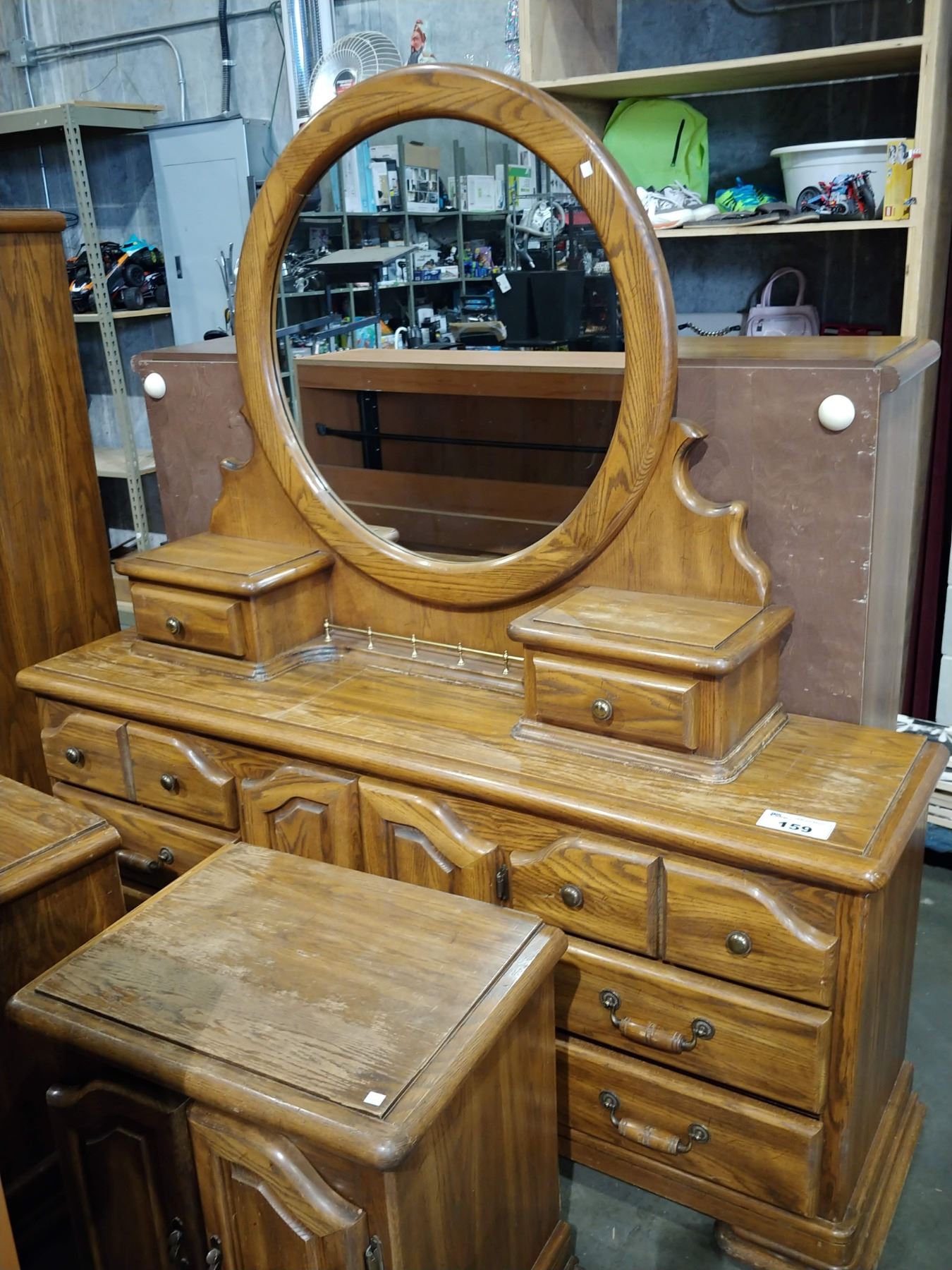 WOOD BEDROOM SUITE INCLUDING DRESSER / VANITY, WARDROBE, HEADBOARD STORAGE AND PAIR OF NIGHTSTANDS