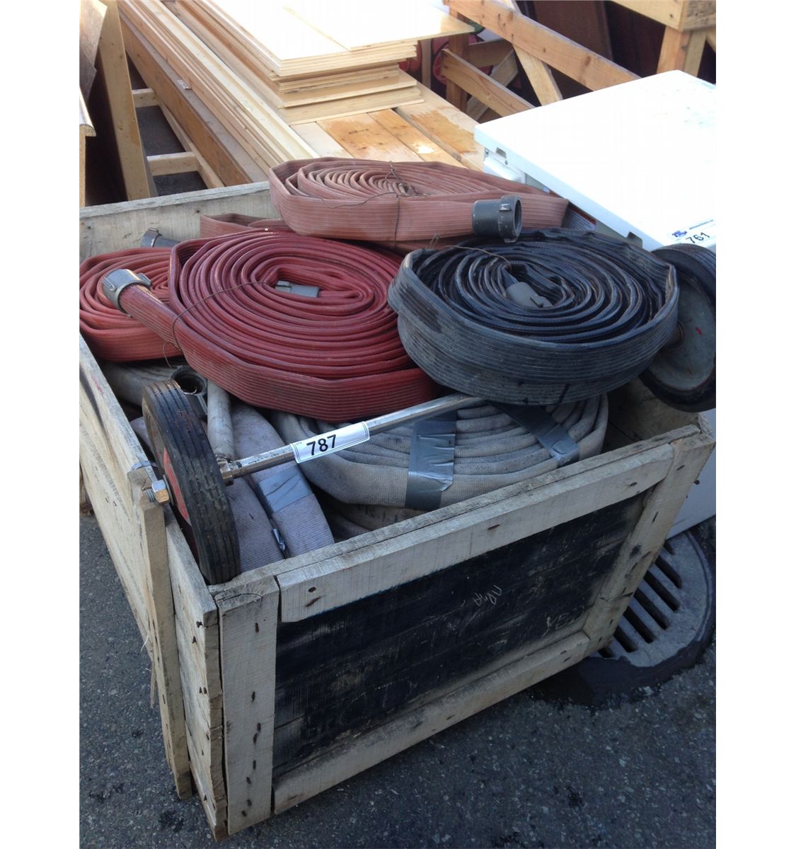 WOOD CRATE FILLED WITH ASSORTED INDUSTRIAL SIZED WATER HOSE