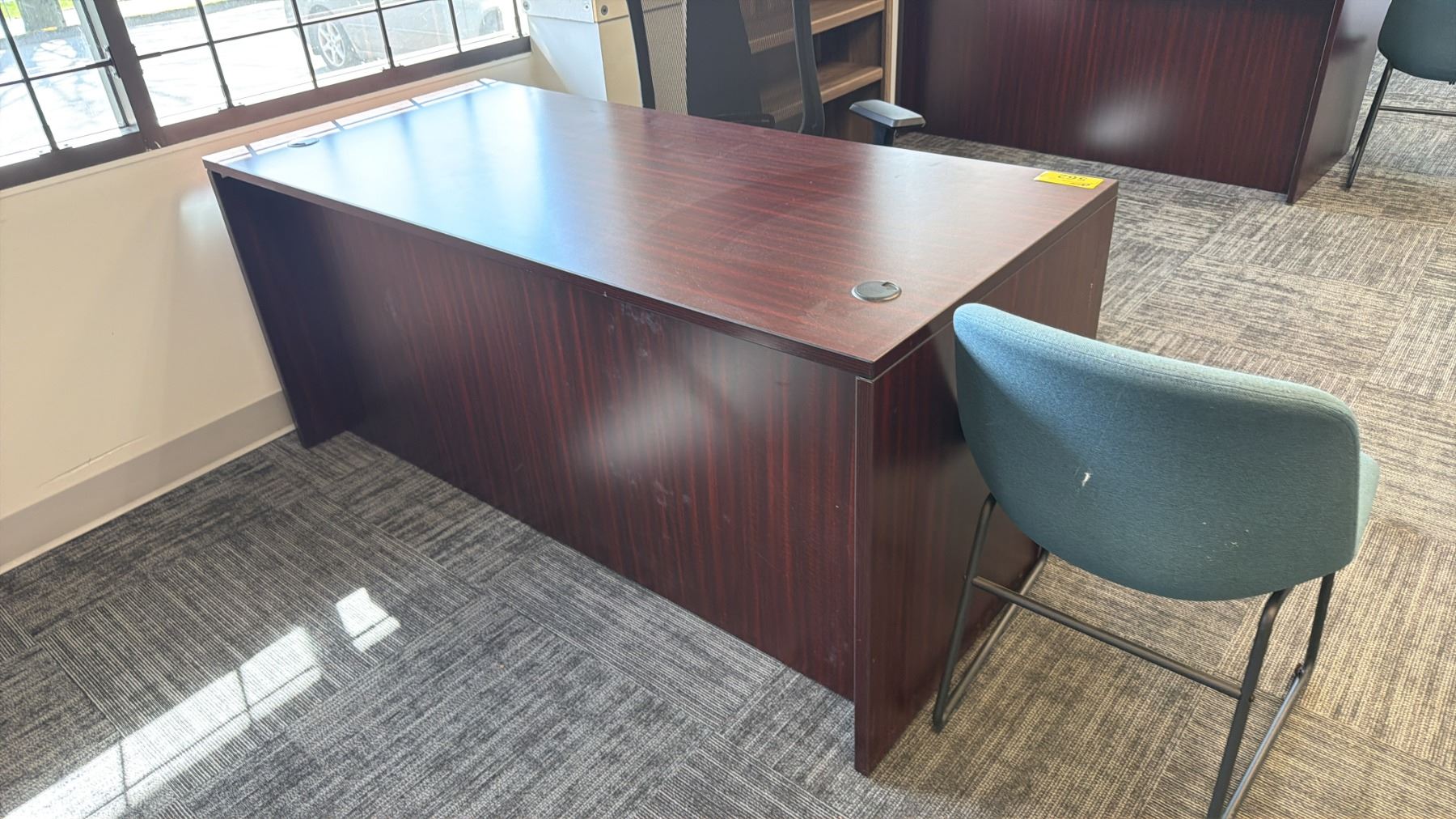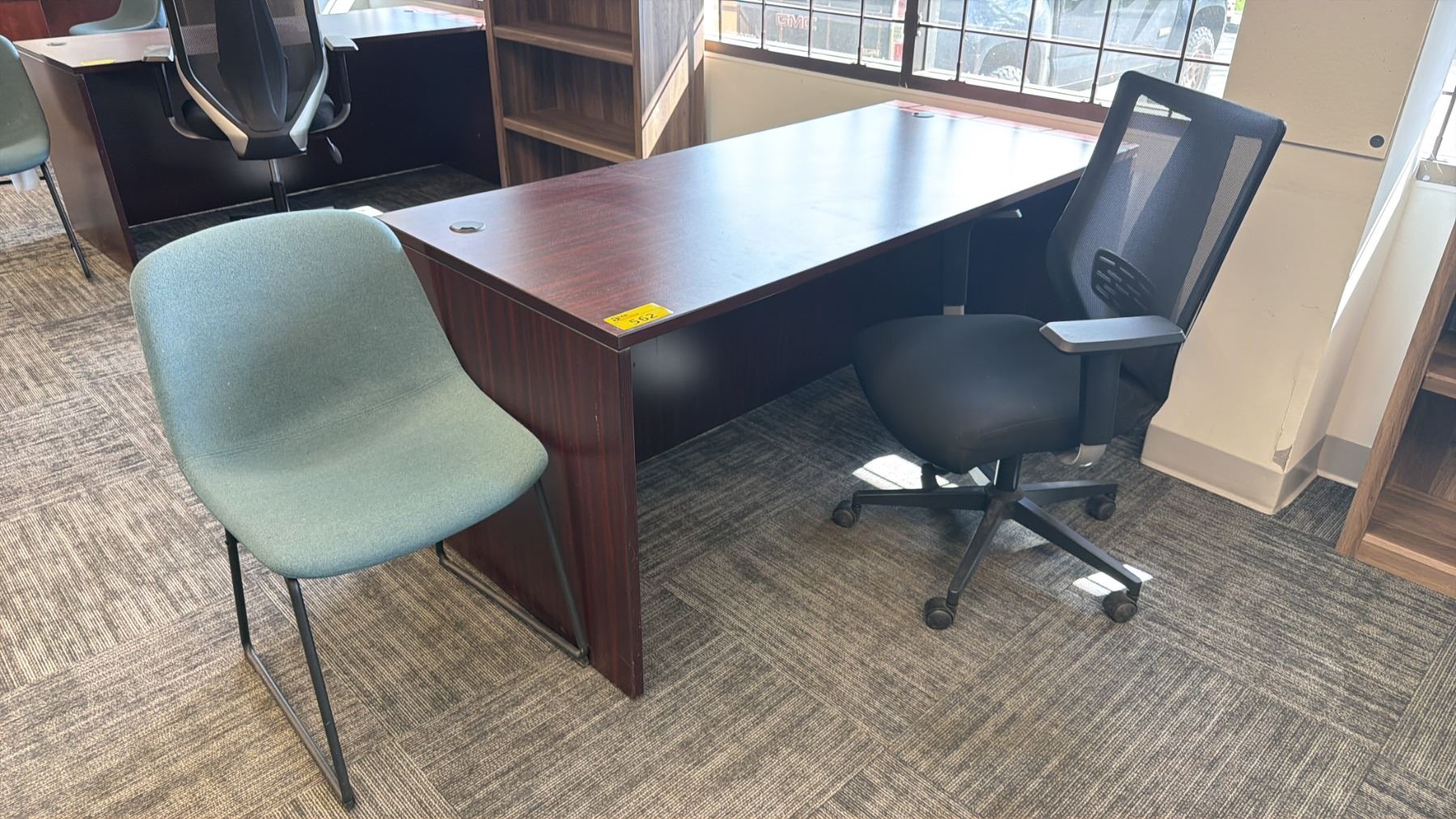 WOOD DESK WITH MESH BACK ROLLING OFFICE CHAIR & CHAIR
